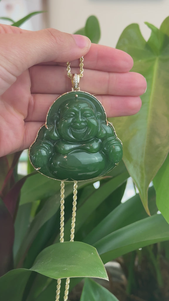 * INTRODUCTION--- This striking pendant is meticulously fashioned from high-quality apple green nephrite jade by a talented artisan, accentuated with a 14k yellow gold setting and a sparkling VS1 diamond. It elegantly portrays the legendary figure of the laughing Buddha, affectionately known as "Jade Buddha." With his iconic large belly and joyful laughter, this depiction exudes warmth and happiness. A charming and meaningful addition to any collection. It's a bigger size for men.