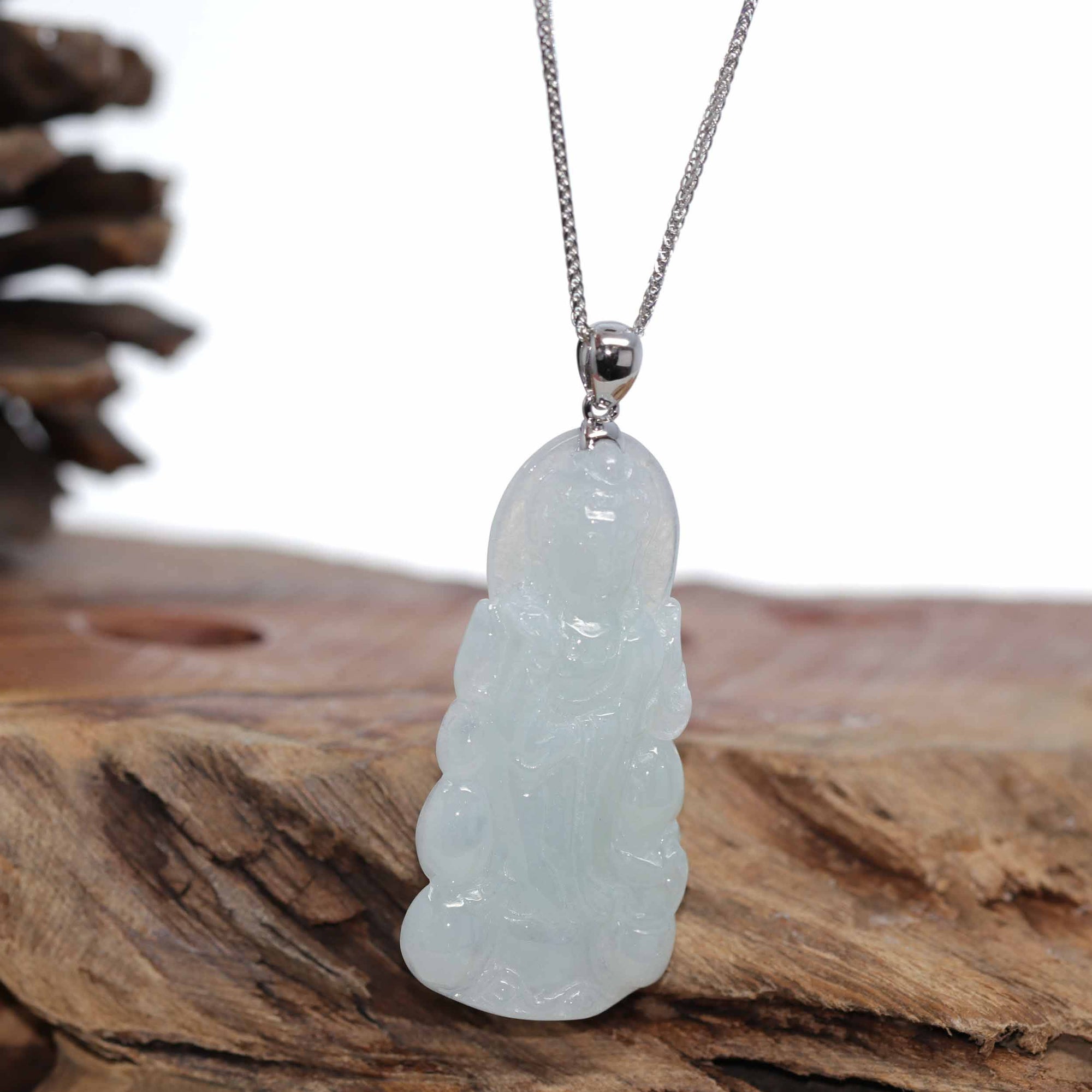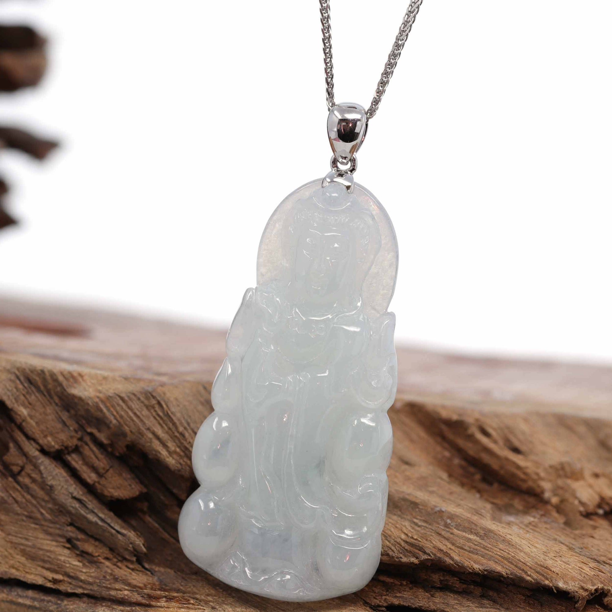 Baikalla Jewelry Jade Guanyin Pendant Necklace Baikalla 14k White Gold "Goddess of Compassion" Genuine Ice Burmese Jadeite Jade Guanyin Necklace With Gold Bail