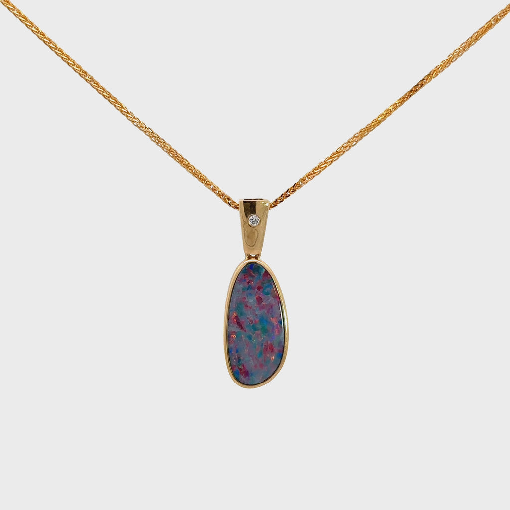 Design Concept--- Introducing the Baikalla 14k Yellow Gold Natural Opal Bezel Set Pendant Necklace, a stunning piece that combines elegance and timeless design. Opals are known for their unique, iridescent colors and this particular gemstone has a one-of-a-kind blue and pink mixture. Its 14k gold bezel adds warmth to the opal with a diamond accents the bail, completing its timeless allure. Elevate your jewelry collection with the Baikalla 14k Yellow Gold Natural Opal Bezel Set Pendant Necklace.