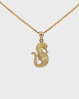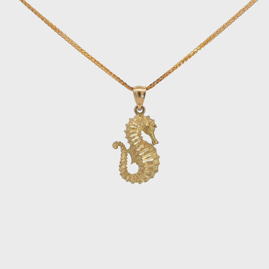 the ocean. Crafted  with meticulous attention to detail, the golden seahorse symbolizes patience, contentment, and protection. Made with solid 14k yellow gold, this pendant makes a great statement accessory for any occasion. Embrace the elegance and whimsy of the seahorse with this finely crafted 14k gold pendant necklace.