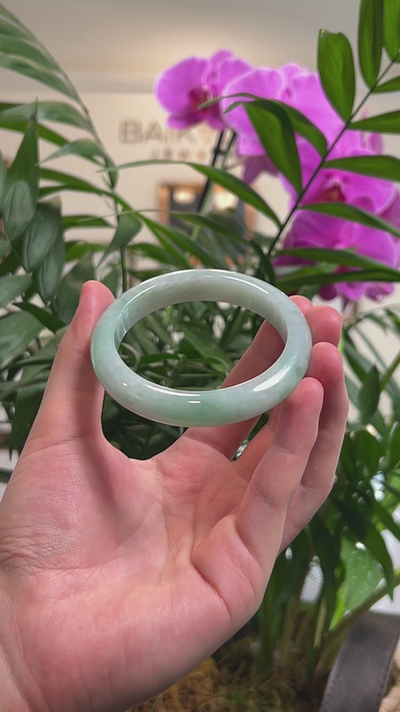 * DETAILS--- This bangle is crafted from genuine Burmese Jadeite jade that features a beautiful apple-green color throughout with patches of vibrant green. The texture is smooth and translucent with minimal natural lines and cloudy spots that reflects the jade’s genuine character. Designed in a half-round, comfort-fit style, the bangle is flat on the inside for a comfortable feel, perfect for everyday wear. Known for its durability, jadeite is also cherished as a symbol of good luck, protection, and harmony. Whether as a gift for yourself or a loved one, this jade bangle is a meaningful treasure that combines natural beauty, lasting craftsmanship, and exceptional value to cherish for years to come.