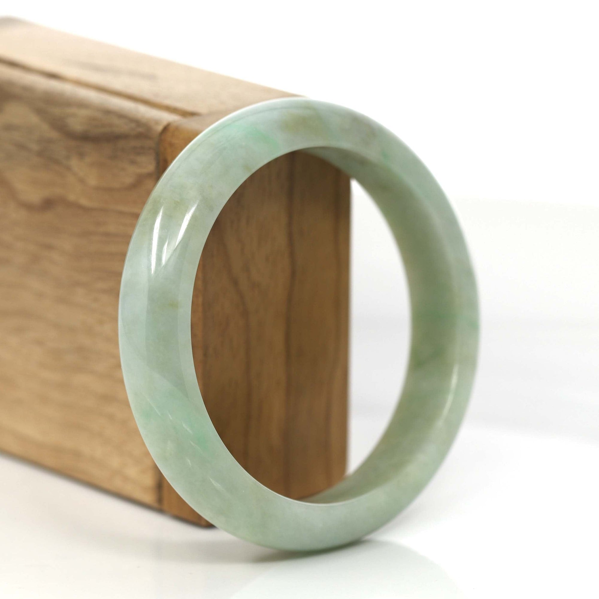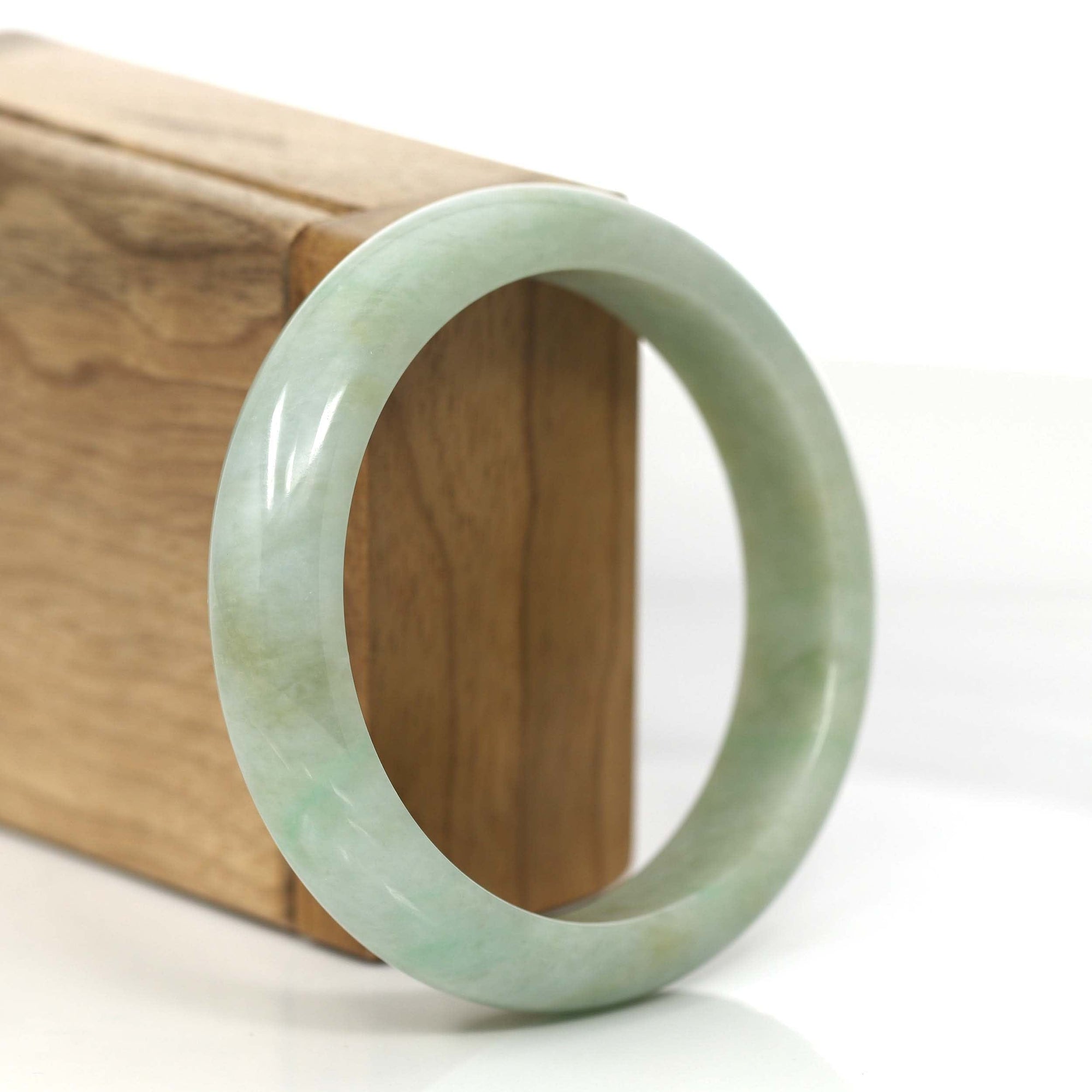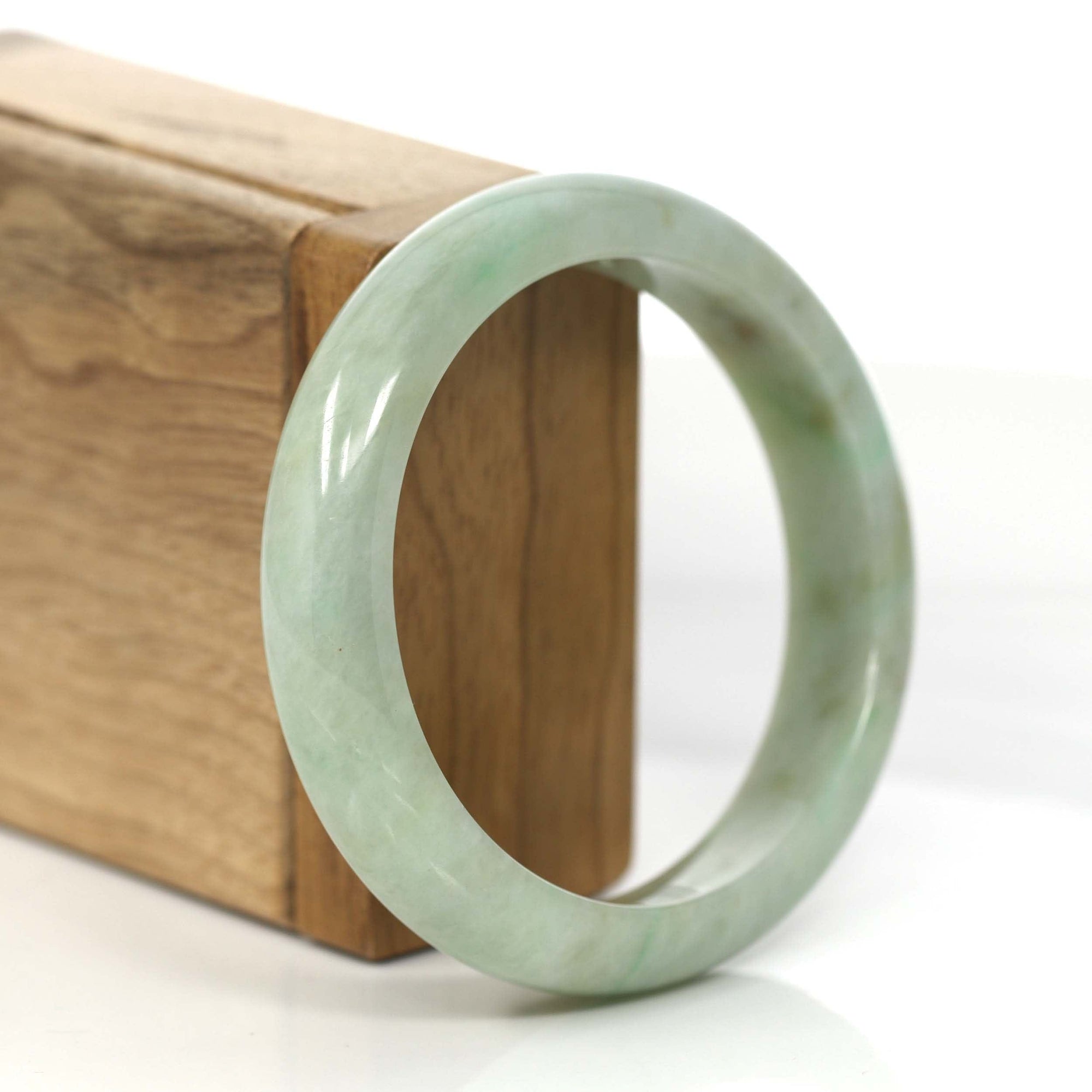 * DETAILS--This bangle is made with fine genuine Burmese Jadeite jade. The jade texture is fine and smooth with some green yellow color. It just has little clouds and little natural line. It's a very unique bangle. The Classic half-round comfort style bracelet. Jadeite jade is the toughest gemstone on the planet. People believe the real jade is a lucky gemstone. It's a special gift for you and your love.