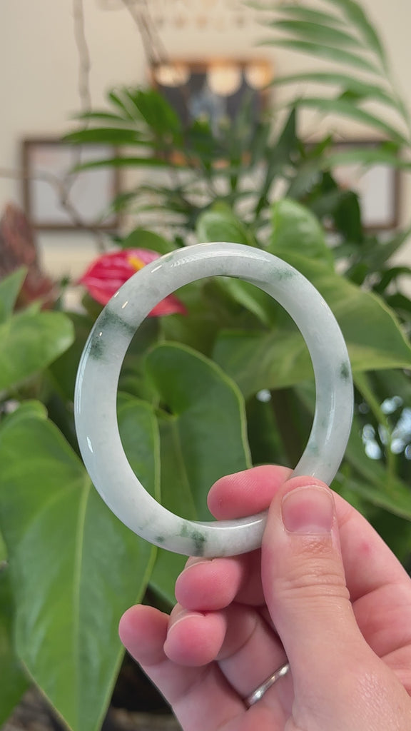 * DETAILS--This bangle is made with genuine Burmese Jadeite jade, The jade texture is very smooth with splashes of blue green color. The blue green color looks very nice, It's a very unique bangle. You know the genuine jade bangle is always meaningful for someone. The Classic half-round wider style bracelet. It's a special gift for yourself or your love.