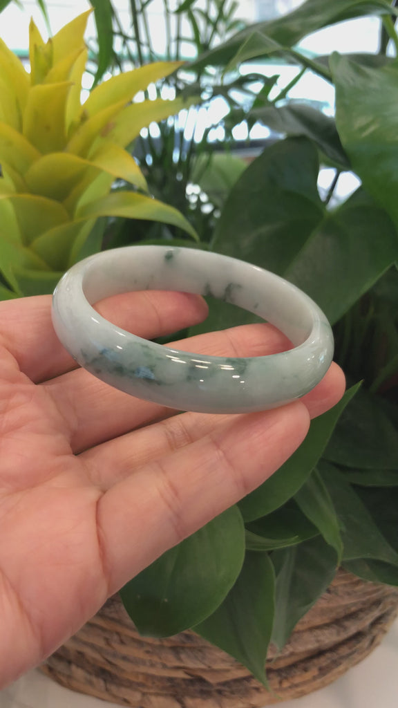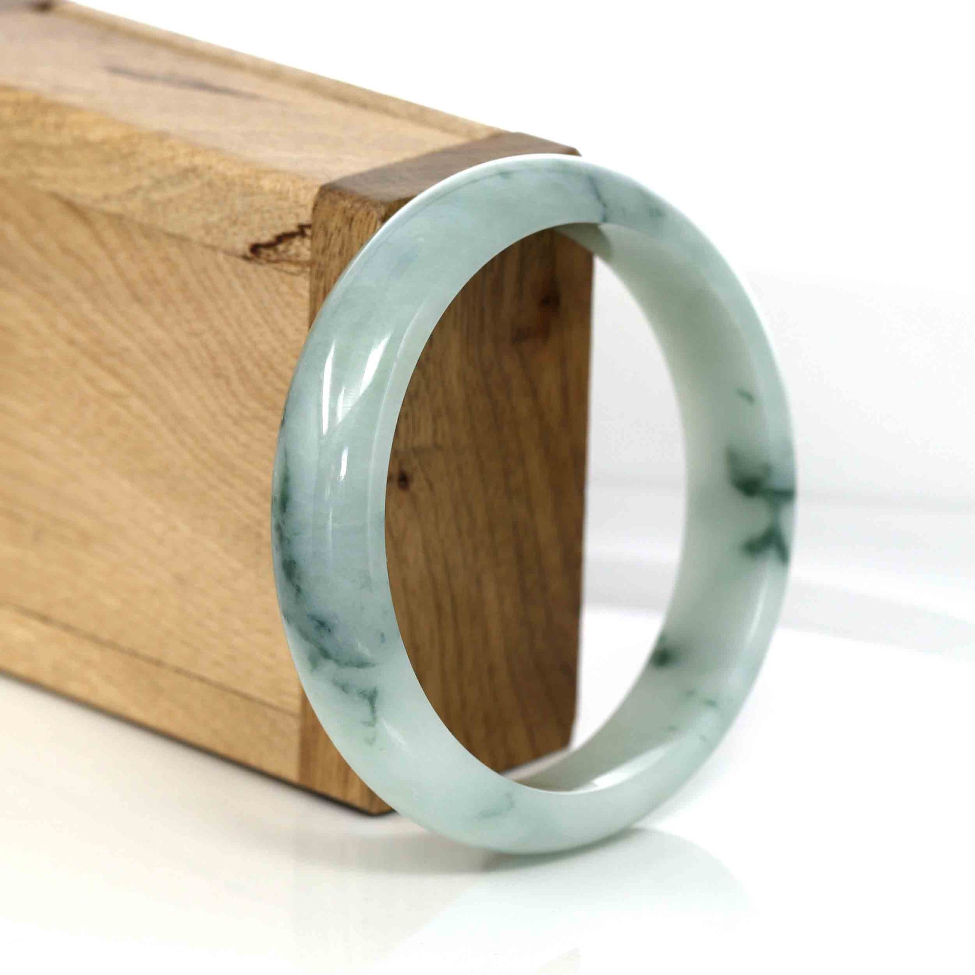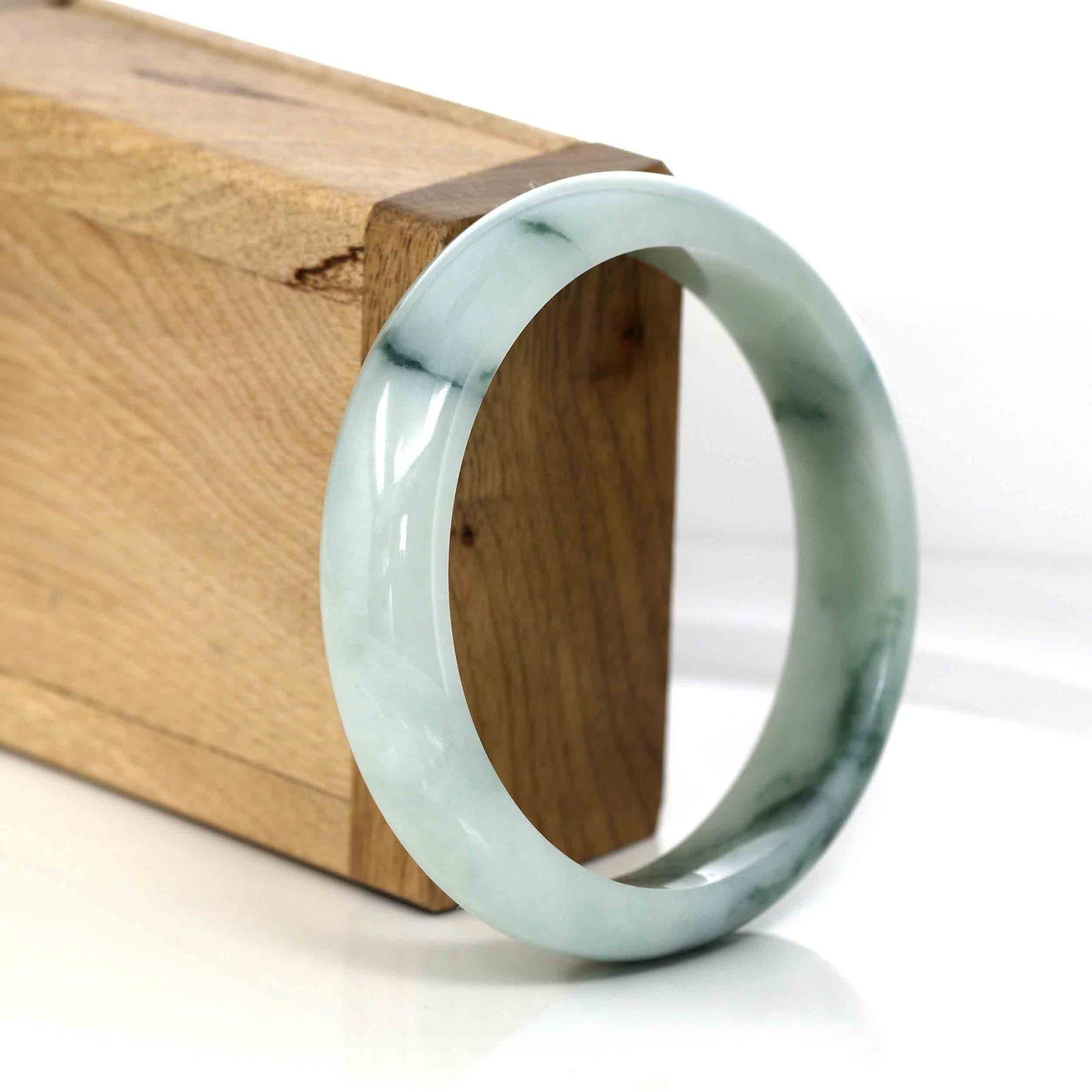 * DETAILS---Genuine Burmese Jadeite Jade Bangle Bracelet. This jade bangle is made with genuine Burmese Jadeite Jade. The jade texture is very smooth and translucent with some blue-green color inside. The blue-green color looks very nice as a landscape painting. It's a very unique bangle. You know the genuine jade bangle is always meaningful for someone. The Classic half-round style bracelet. It's a special gift for yourself or your love.