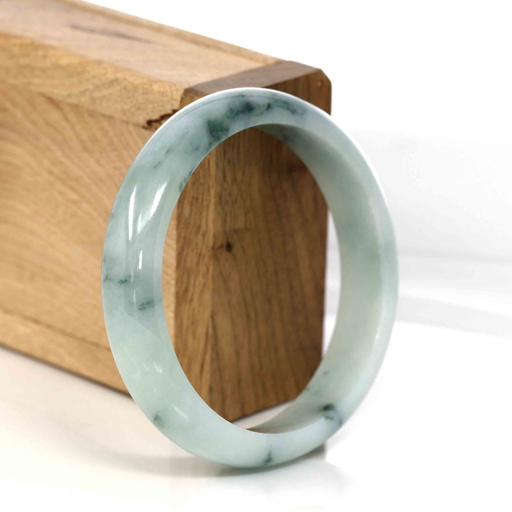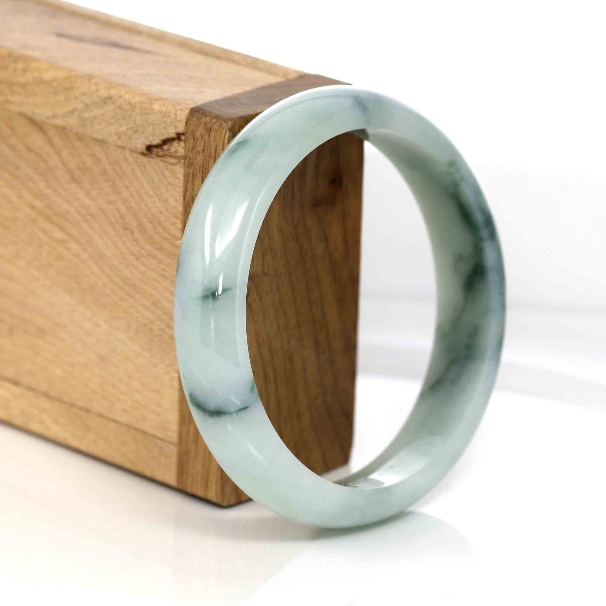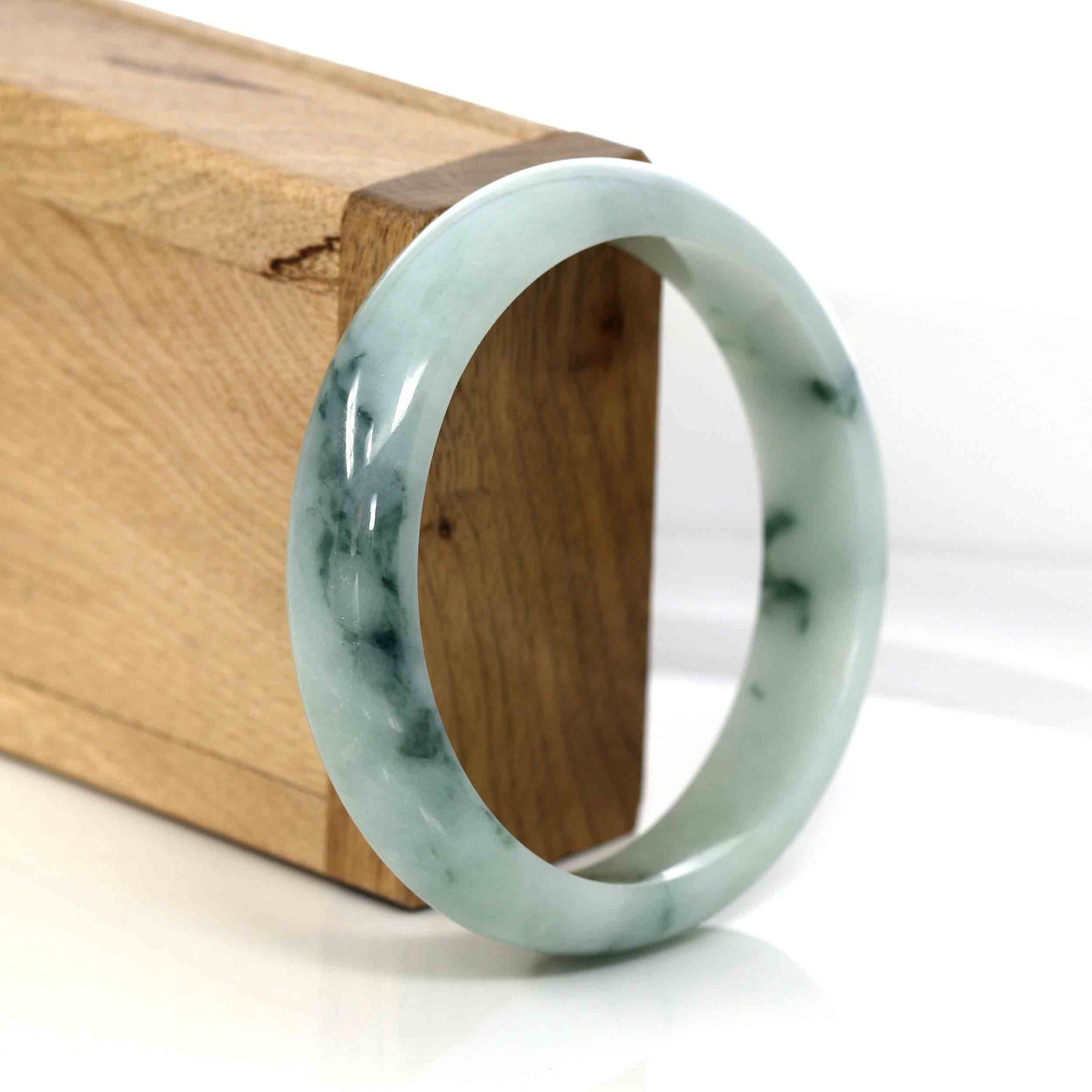 * DETAILS---Genuine Burmese Jadeite Jade Bangle Bracelet. This jade bangle is made with genuine Burmese Jadeite Jade. The jade texture is very smooth and translucent with some blue-green color inside. The blue-green color looks very nice as a landscape painting. It's a very unique bangle. You know the genuine jade bangle is always meaningful for someone. The Classic half-round style bracelet. It's a special gift for yourself or your love.