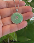 * Design Concept--- The simple shape of a circle represents things such as happiness, wholeness, and prosperity. Or as Sotheby's auction house called a jade bangle. "Circle of Heaven". This necklace is made with very high-quality genuine Burmese green jadeite jade. Which produces some of the finest in the world. Refined, exquisite. Very very slightly included. Gifting one of these is like wishing the best of luck to your family or loved ones. It's a perfect gift.