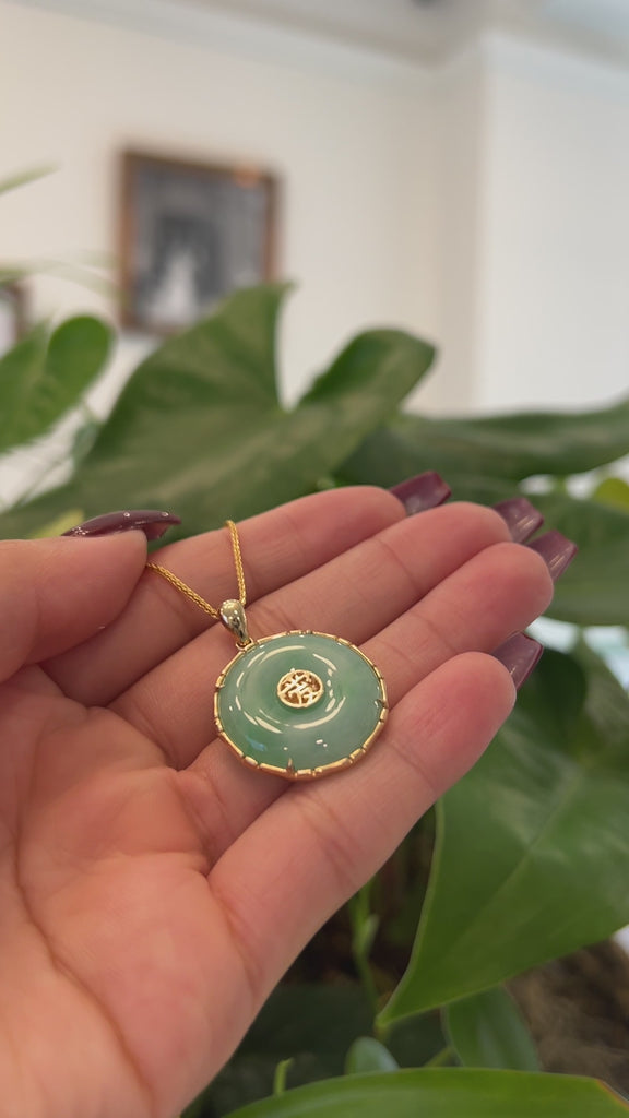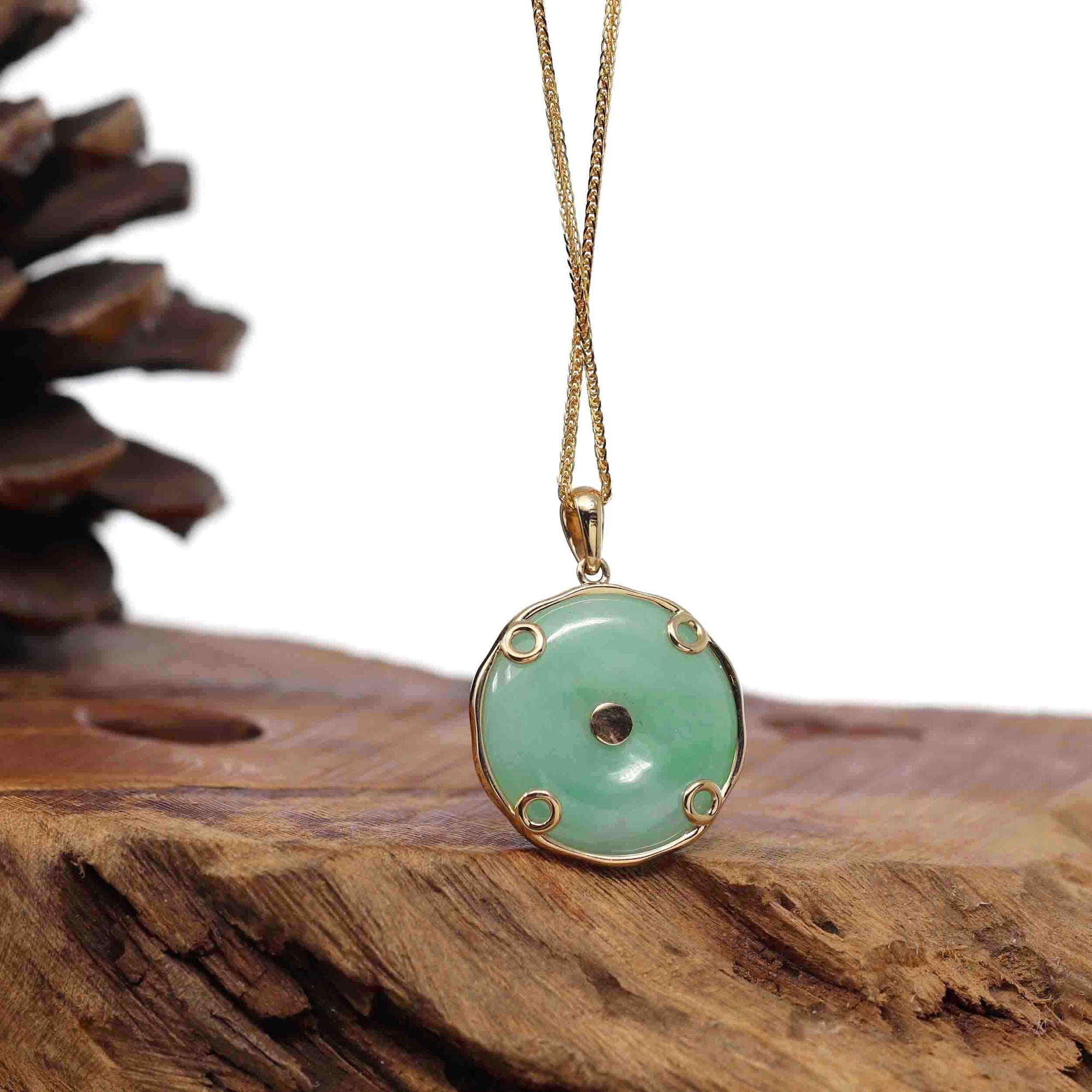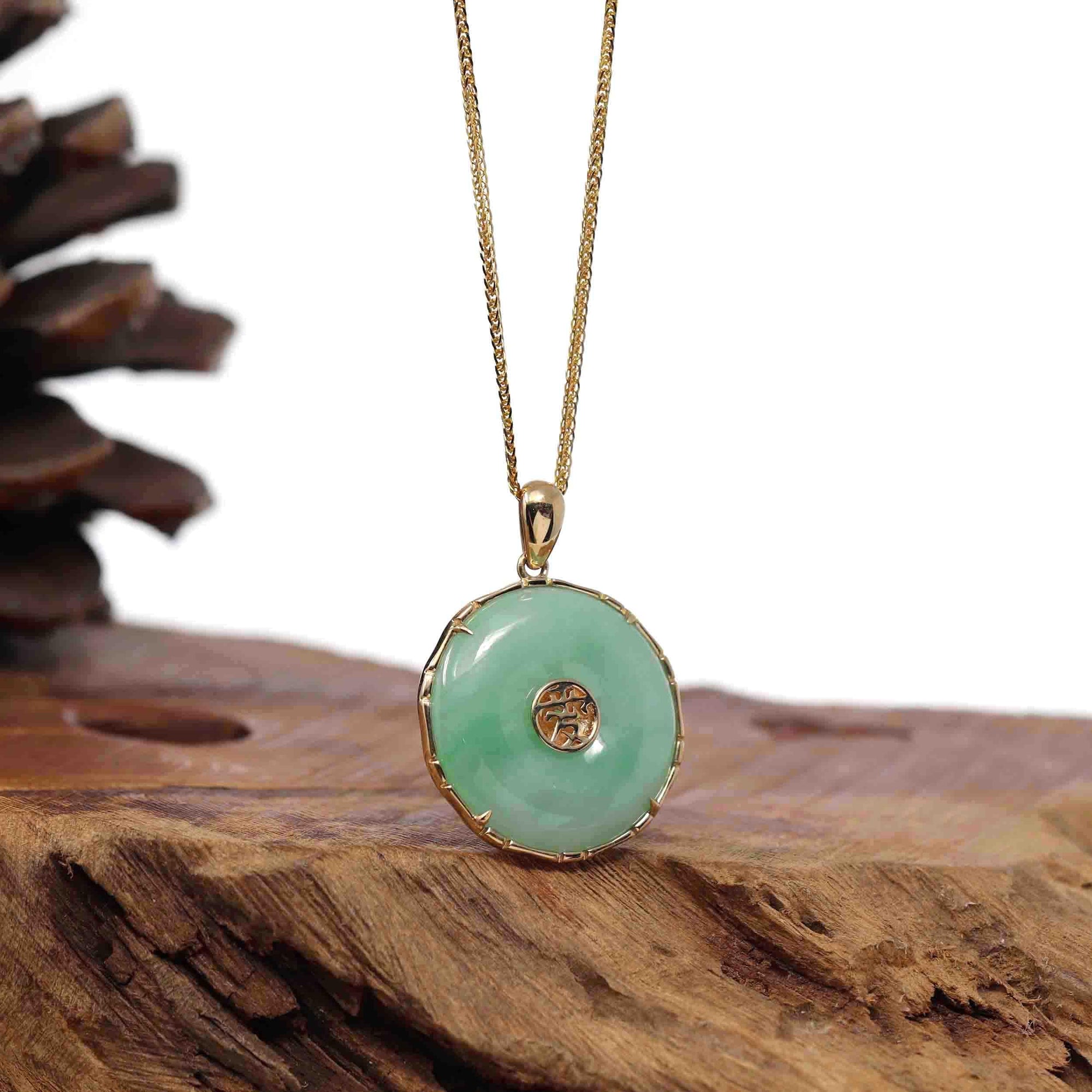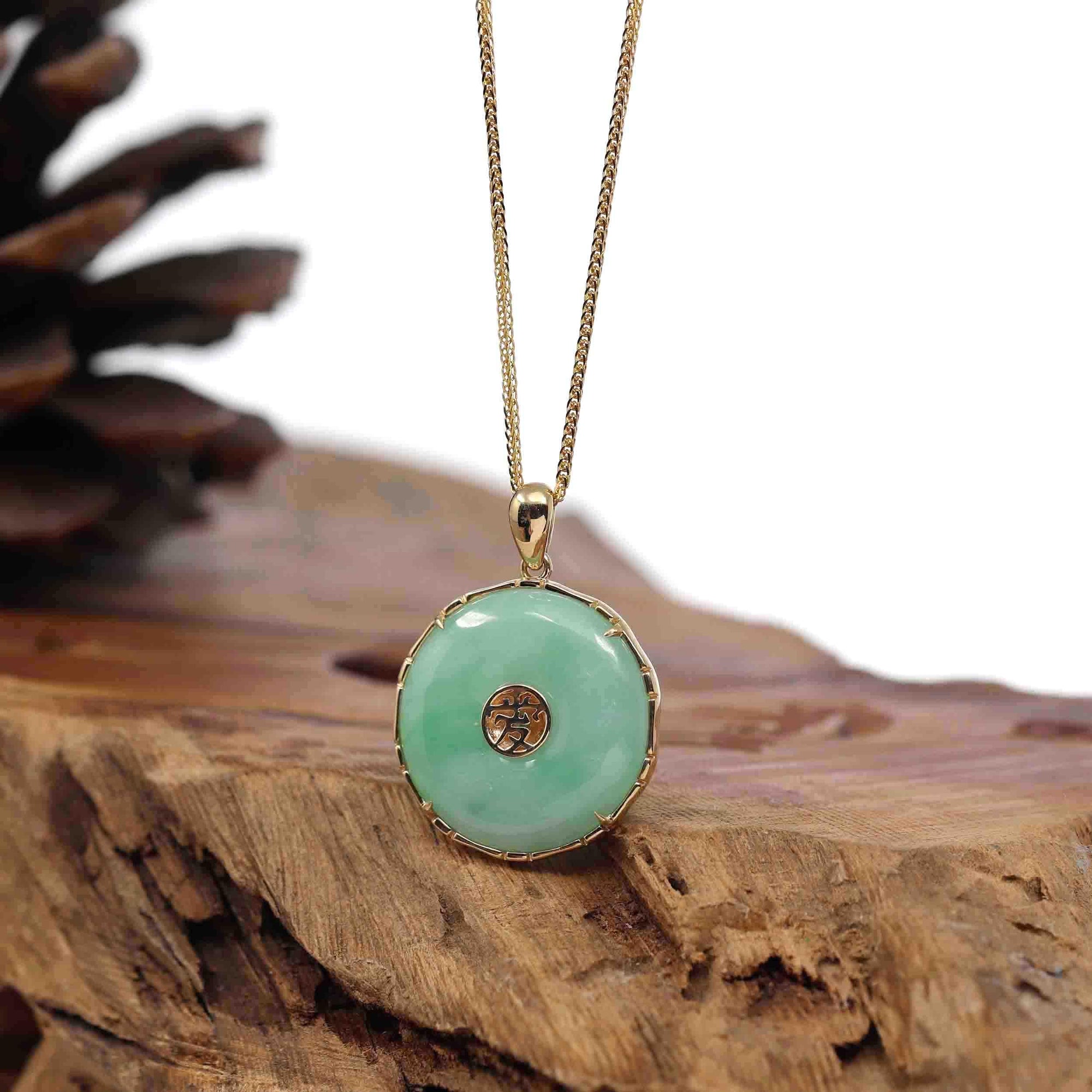 * Design Concept--- The simple shape of a circle represents things such as happiness, wholeness, and prosperity. Or as Sotheby's auction house called a jade bangle. "Circle of Heaven". This necklace is made with very high-quality genuine Burmese lavender jadeite jade. Which produces some of the finest in the world. Refined, exquisite. Very slightly included. Gifting one of these is like wishing the best of luck to your family or loved ones. It's a perfect gift.