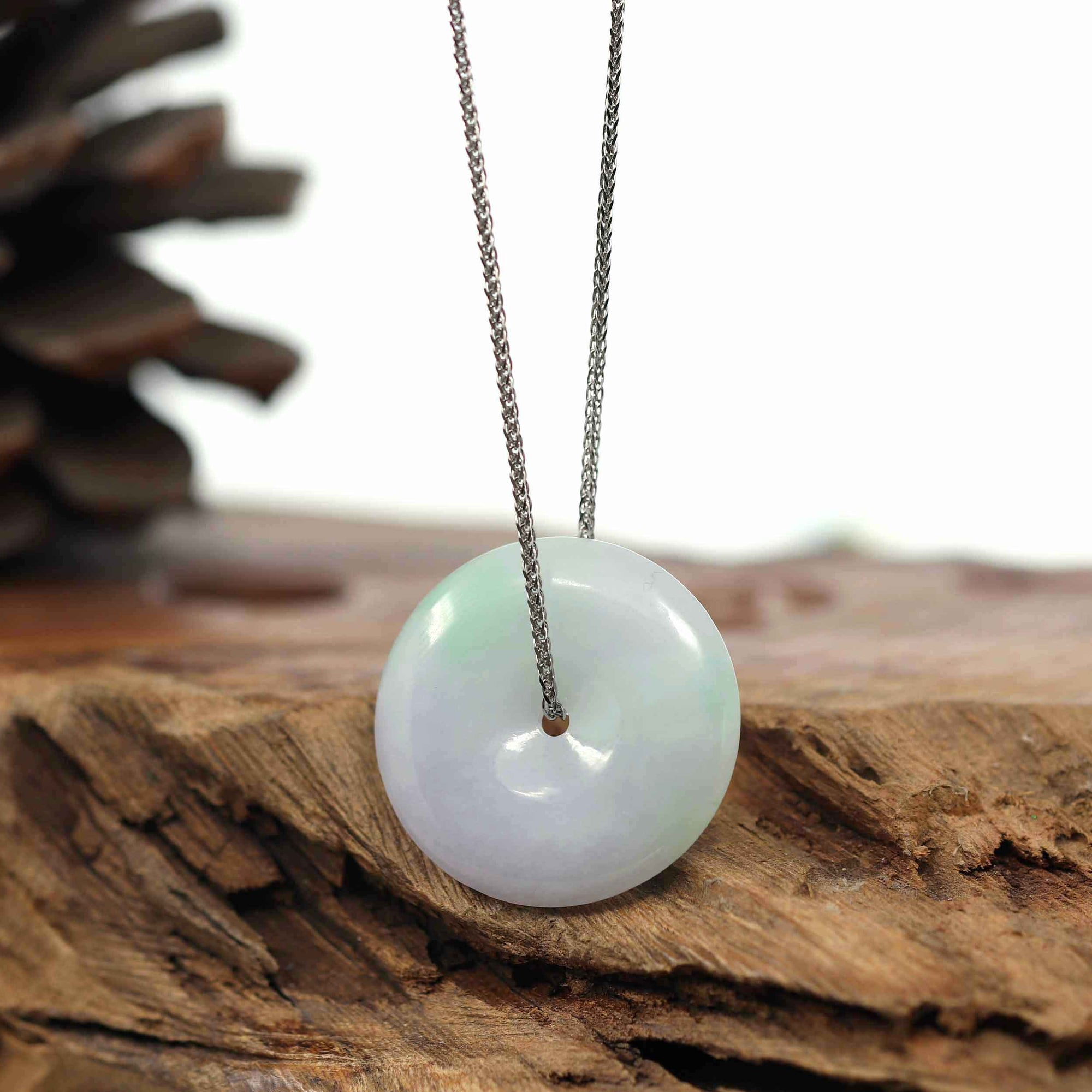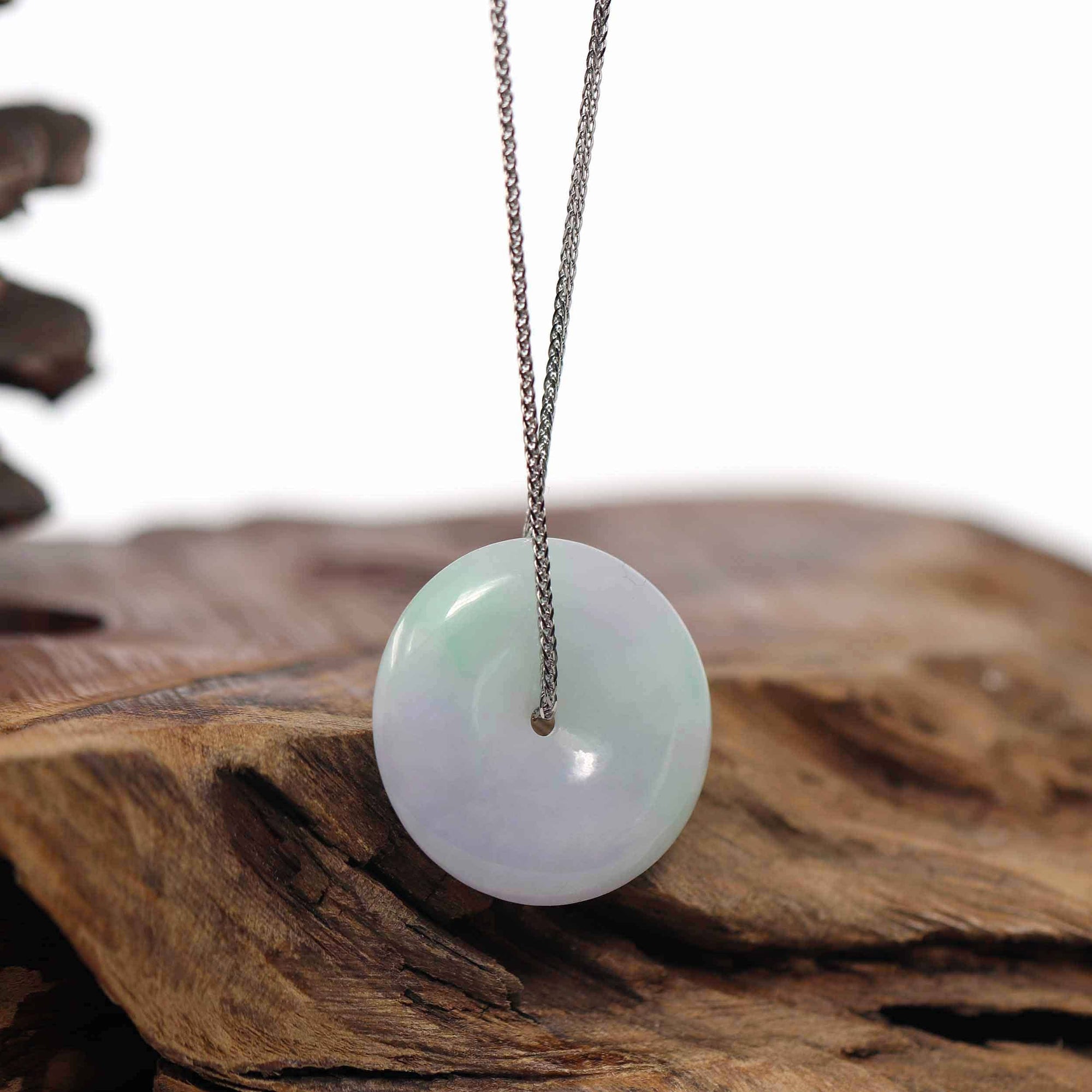 * Design Concept--- Introducing the Baikalla "Good Luck Button" Necklace, a captivating pendant that combines craftsmanship and allure of jadeite jade. The phrase "Circle of Heaven" is shown through the jades smooth shape that represents happiness, wholeness, and prosperity. High-quality lavender and unique stripe of green makes this necklace great for everyday wear or for special occasions. Embrace the Circle of Heaven and all its prosperity with the Baikalla "Good Luck Button" Necklace.