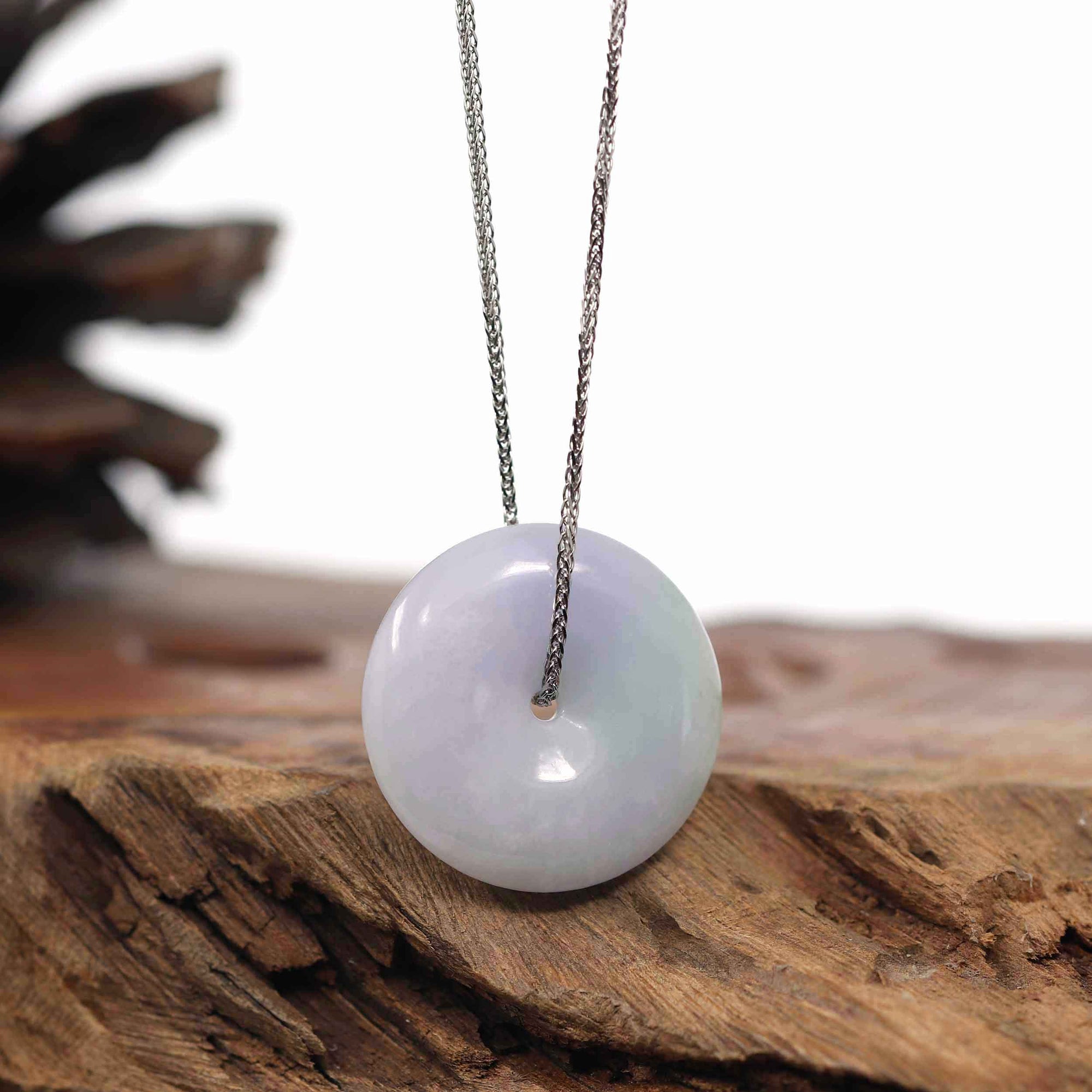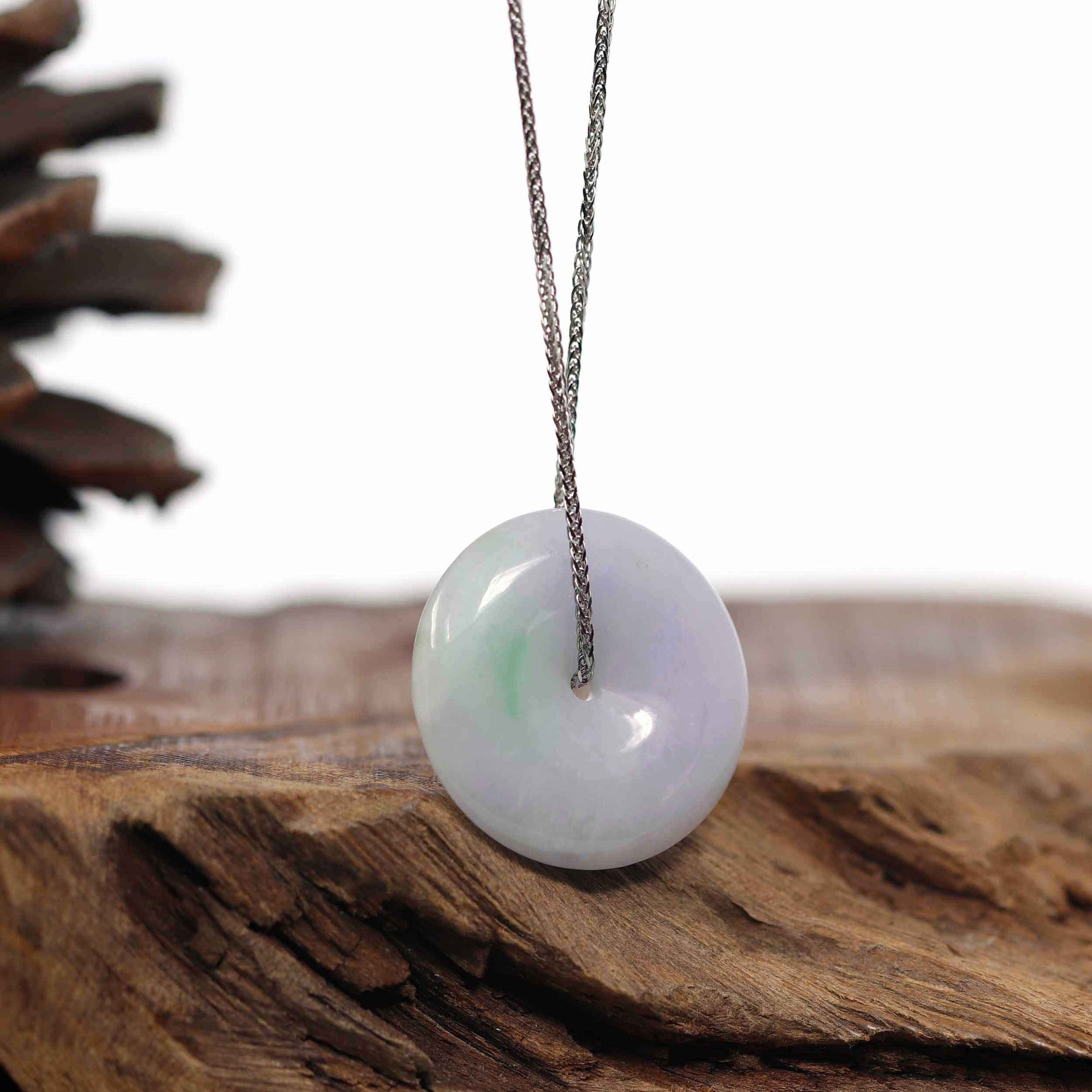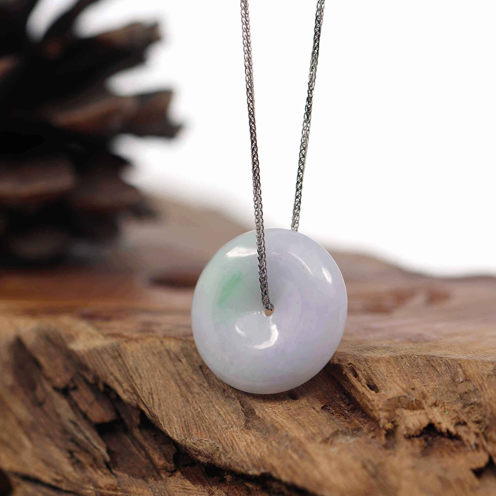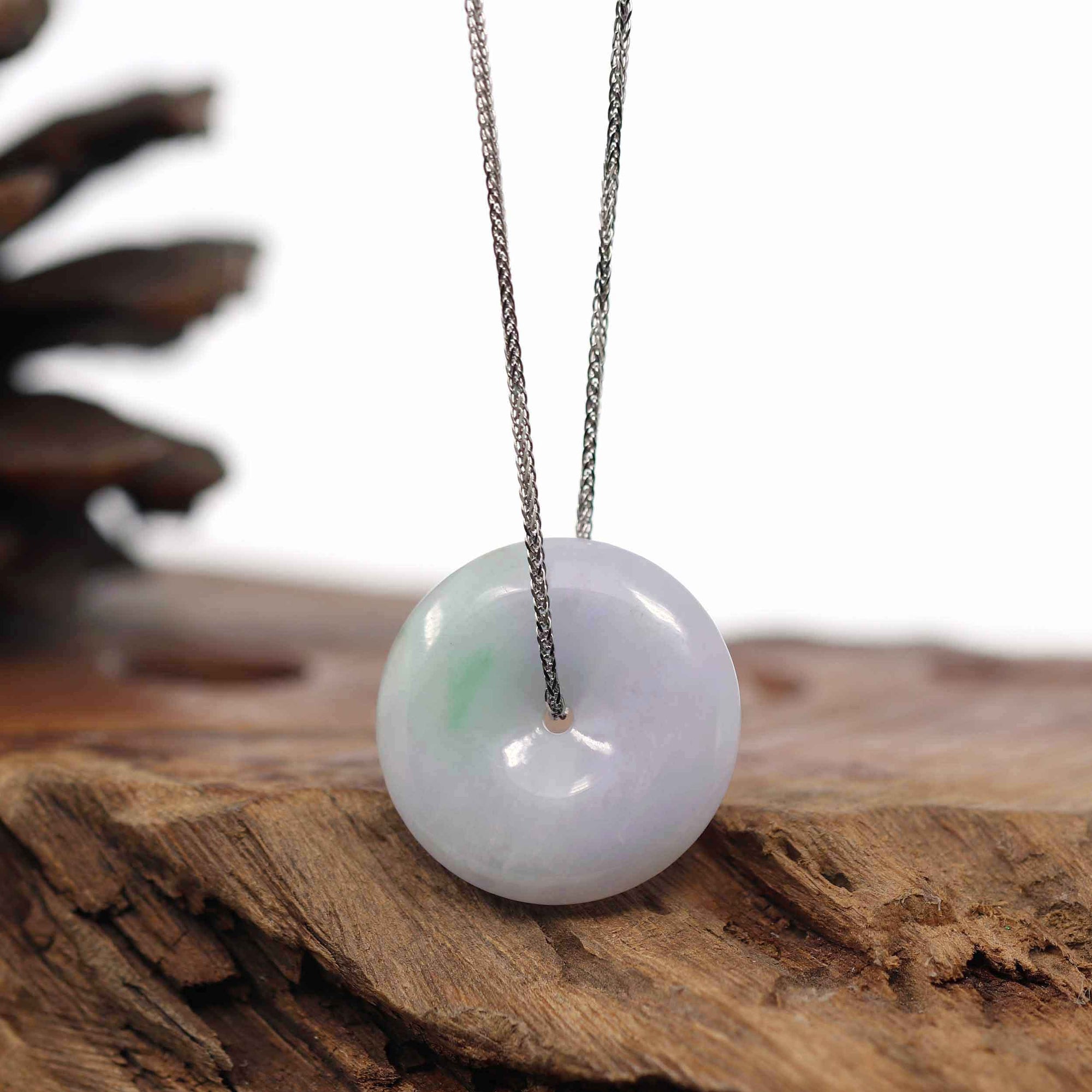 * Design Concept--- Introducing the Baikalla "Good Luck Button" Necklace, a captivating pendant that combines craftsmanship and allure of jadeite jade. The phrase "Circle of Heaven" is shown through the jades smooth shape that represents happiness, wholeness, and prosperity. High-quality lavender and unique stripe of green makes this necklace great for everyday wear or for special occasions.