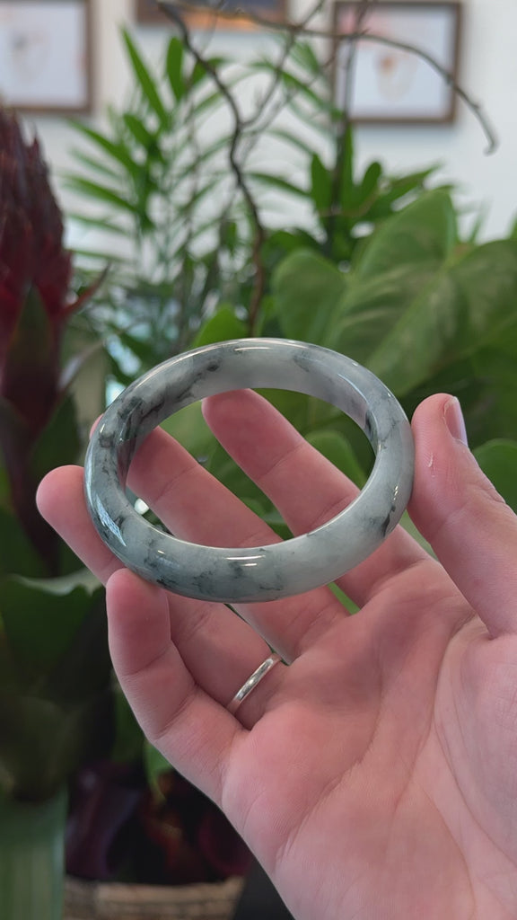 * DETAILS--- This exquisite bangle is crafted from Burmese Jadeite in a blue-green hue. With its captivating color, it radiates a timeless elegance and cultural heritage. The classic half-round comfort design enhances the jade’s natural beauty with simplicity, making this bracelet a cherished addition to any jewelry collection. The bangle features very unique color pattern with smooth texture. Just has some small natural lines. This bangle has such a unique color pattern making this piece a thoughtful, one-of-a-kind gift for yourself or someone truly special.