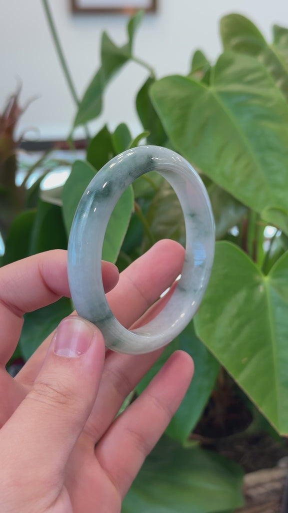 * DETAILS--- This bracelet is crafted from quality, genuine Burmese icy blue-green Jadeite Jade with patches of "floating" blue green color. The jade’s texture is smooth and semi - icy translucent, featuring a captivating blue green color through out, with no natural lines and no cloudy spots. The bangle has great icy translucency and beautiful fine texture. The bangle has a classic full-round style that enhances its elegance also offers comfort, making it a perfect piece for jade lovers and collectors alike. Larger size bangle.