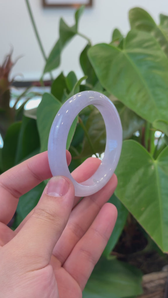 * DETAILS--- This bracelet is crafted from high quality, genuine Burmese icy lavender Jadeite Jade. The jade’s texture is very smooth and icy translucent, featuring a captivating lavender color through half of the bangle and other side slightly lighter, with one small natural line on the inside and no cloudy spots. The bangle has great icy translucency and beautiful fine texture. The bangle has a classic full-round style that enhances its elegance also offers comfort, making it a perfect piece for jade lovers and collectors alike.
