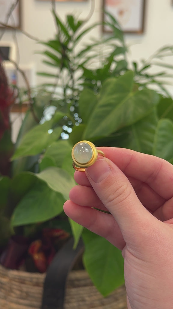 * ORIGINAL DESIGN --- This ring features high-quality ice green jadeite jade in a smooth, oval shape, elegantly bezel-set. Its icy texture gives it a simple yet luxurious look. With an exquisite design, it adds beauty and meaning, making it a unique and elegant piece for any special moment.