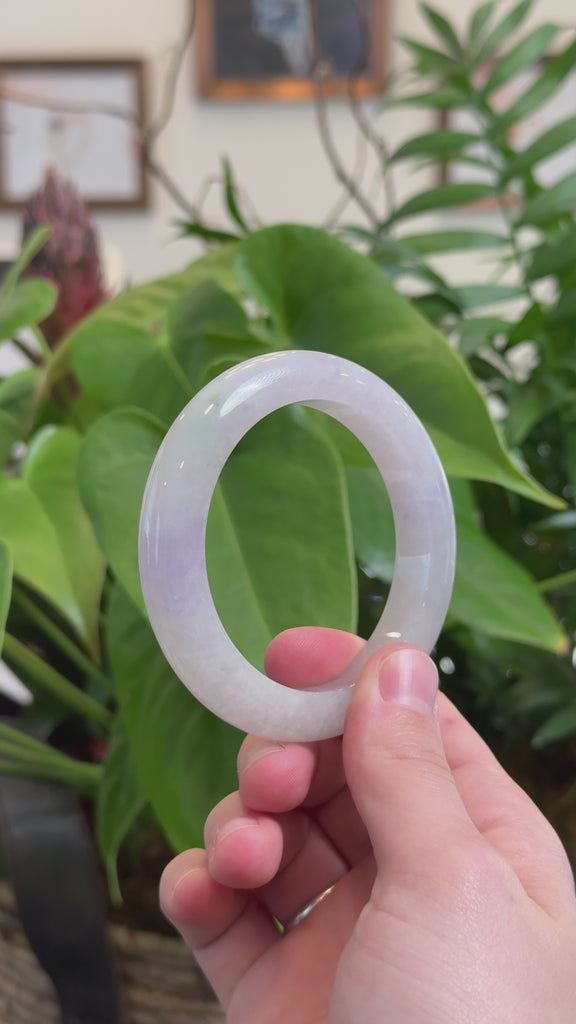 * DETAILS--This bangle is made from high-quality genuine Burmese Jadeite jade. It has a very smooth & translucent ice texture with a light lavender green colors throughout. The classic half-round design offers comfort and style. Jadeite jade is one of the toughest gemstones, and it's believed to bring good luck. This bangle makes a special gift for you or a loved one.