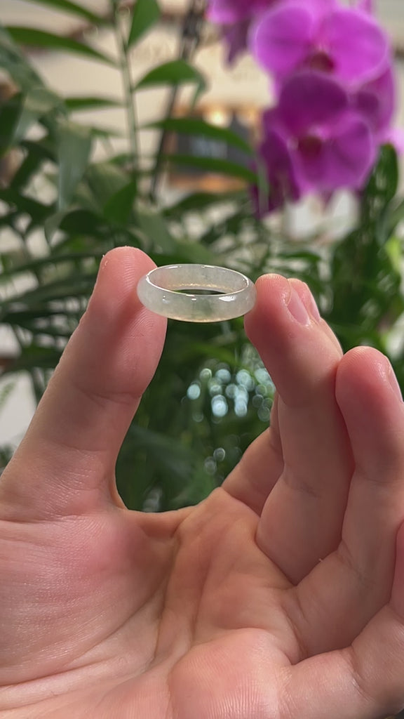 * DETAILS--- This ring is crafted from natural Burmese jadeite jade that features an icy light green color throughout with a more saturated green flower patch. The texture is smooth and translucent with no natural lines and minimal cloudy spots. Known for its durability, jadeite is also believed to bring good luck. This ring makes a thoughtful and meaningful gift for yourself or someone special.