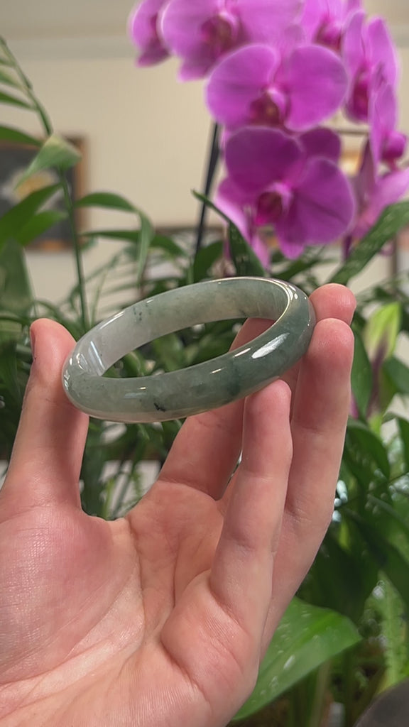 DETAILS--- This oval bangle is crafted from high quality, natural Burmese Jadeite jade that features an icy oil-green color blend throughout with light specks of blue-green flower. The jade texture is smooth and translucent with no natural lines and minimal cloudy spots. It's a half-round, comfort fit oval bangle that is flat on the inside, making it comfortable for everyday wear. Known for its durability, jadeite is also believed to bring good luck. Whether as a gift for yourself or a loved one, this jade bangle is a meaningful treasure that combines natural beauty, lasting craftsmanship, and exceptional value to cherish for years to come.