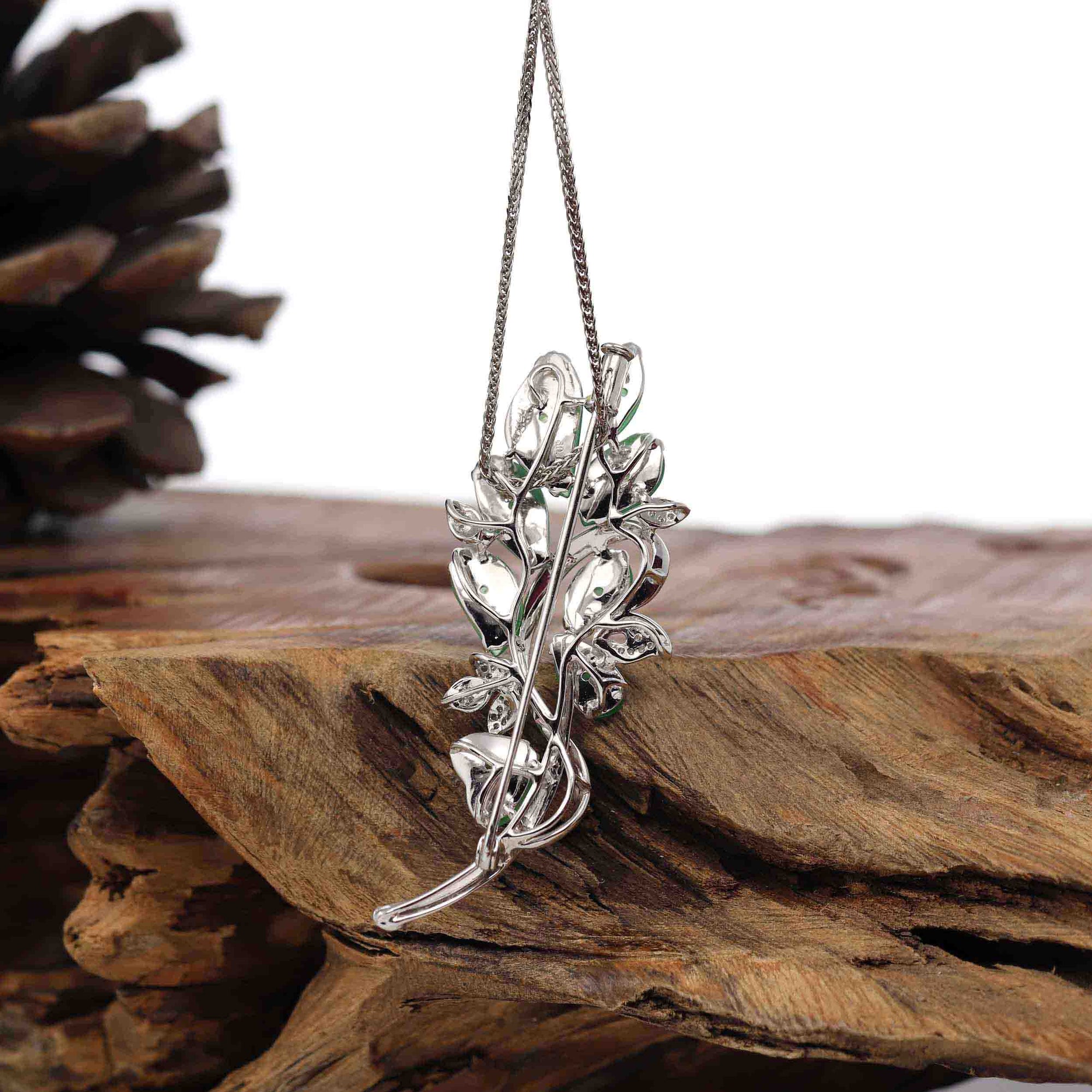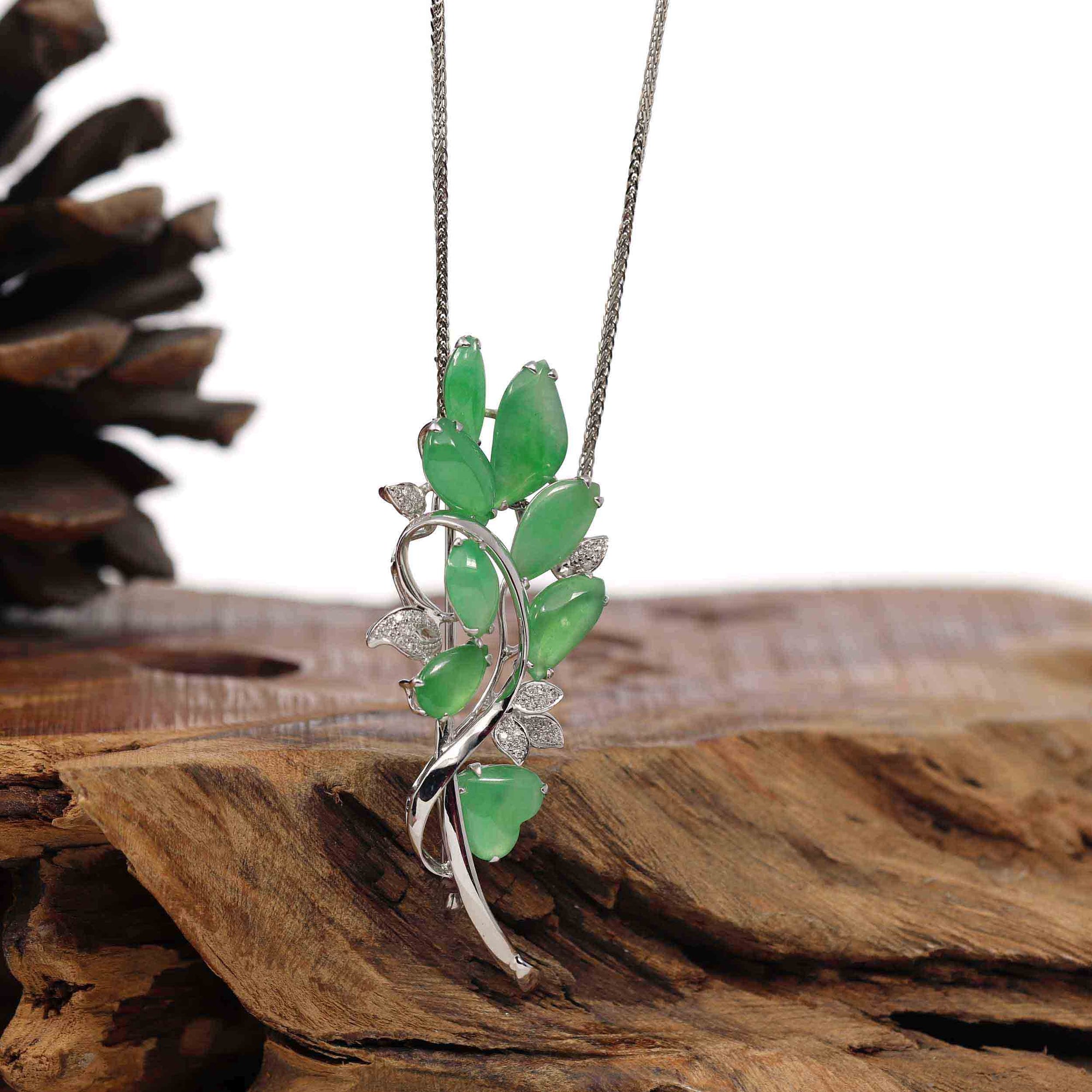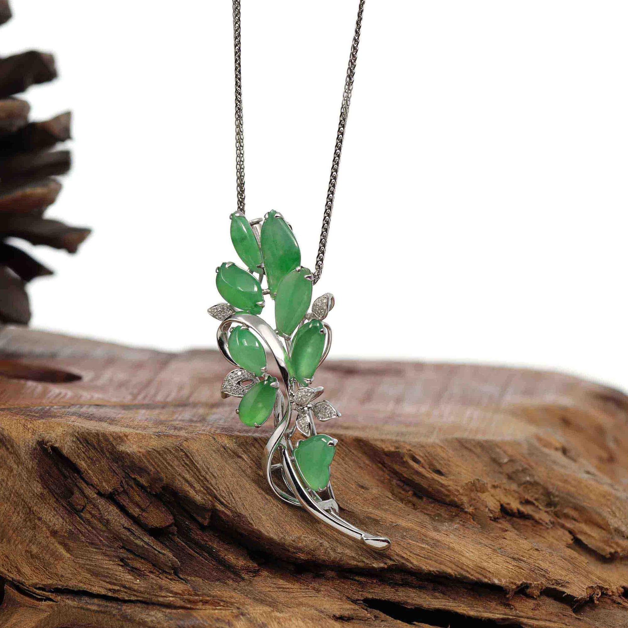 * DESIGN CONCEPT--- This brooch is made with genuine imperial green Burmese jadeite jade. The design was inspired by the simplistic yet elegant shape of a butterfly. Representing wholeness, completeness, and contentment. The unique finish on the 18k white gold adds another layer of uniqueness to your necklace or brooch 2 in 1. Every angle and detail is exquisite. It's a perfect gift for yourself and your love. It's a high-end genuine jade jewelry for collectibles.