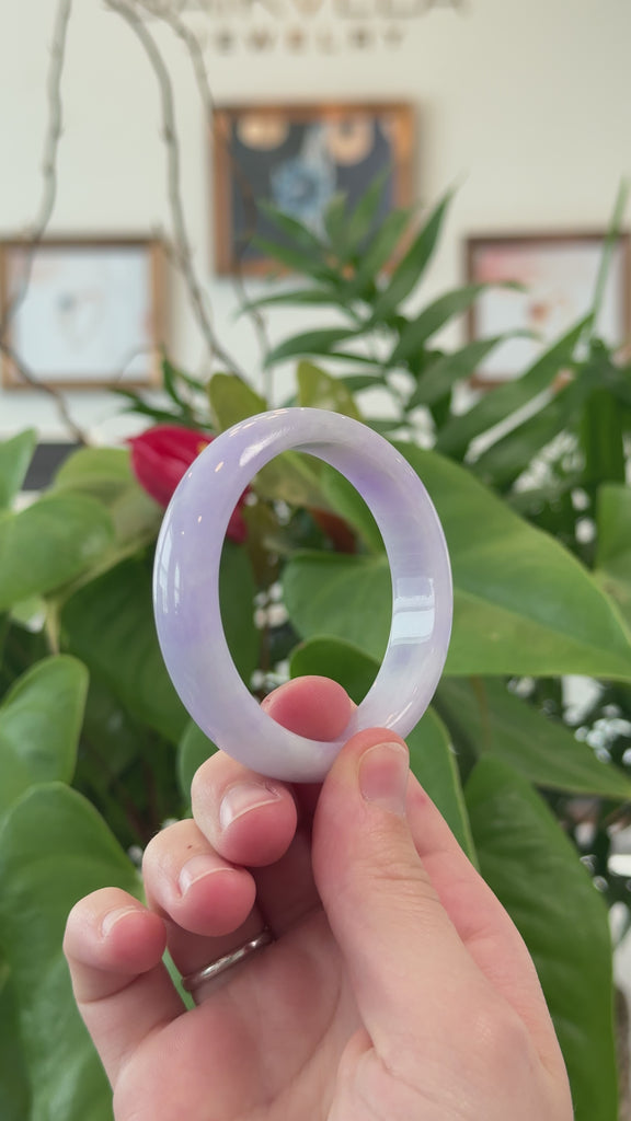 * DETAILS--This exquisite bangle is crafted from premium Burmese jadeite, showcasing a beautiful blend of lavender tones. Its smooth texture and timeless design exude elegance. The traditional round shape perfectly highlights the natural beauty of the jade, making it a versatile and stylish piece. A meaningful and thoughtful gift — perfect for yourself or someone truly special.