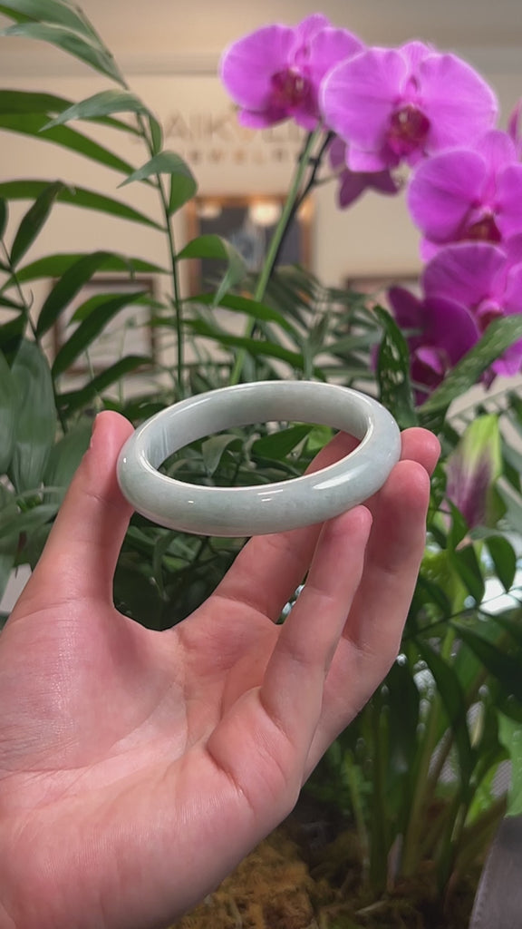 * DETAILS: This bangle is crafted from genuine Burmese Jadeite jade. It features soft apple-green and white-green colors throughout. The texture is smooth and semi-translucent texture with minimal natural lines and cloudy spots. It's a half round, comfort-fit bangle, which is flat on the inside and comfortable for everyday wear. Known for its durability, jadeite is also believed to bring good luck. This bangle makes a thoughtful and meaningful gift for yourself or someone special.