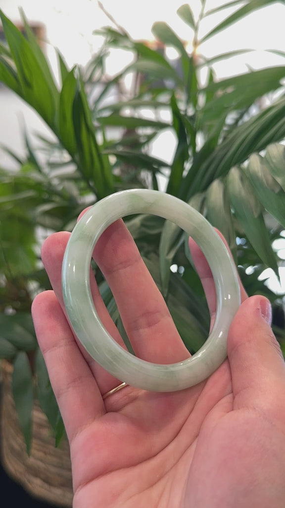 * DETAILS--- This bangle is crafted from genuine Burmese Jadeite jade. It features a smooth, translucent texture with a light green flower color throughout. Has some cloudiness and natural lines. It's a full round, traditional bangle, which gives the bangle a more petite look at this larger size. Known for its durability, jadeite is also believed to bring good luck. This bangle makes a thoughtful and meaningful gift for yourself or someone special.
