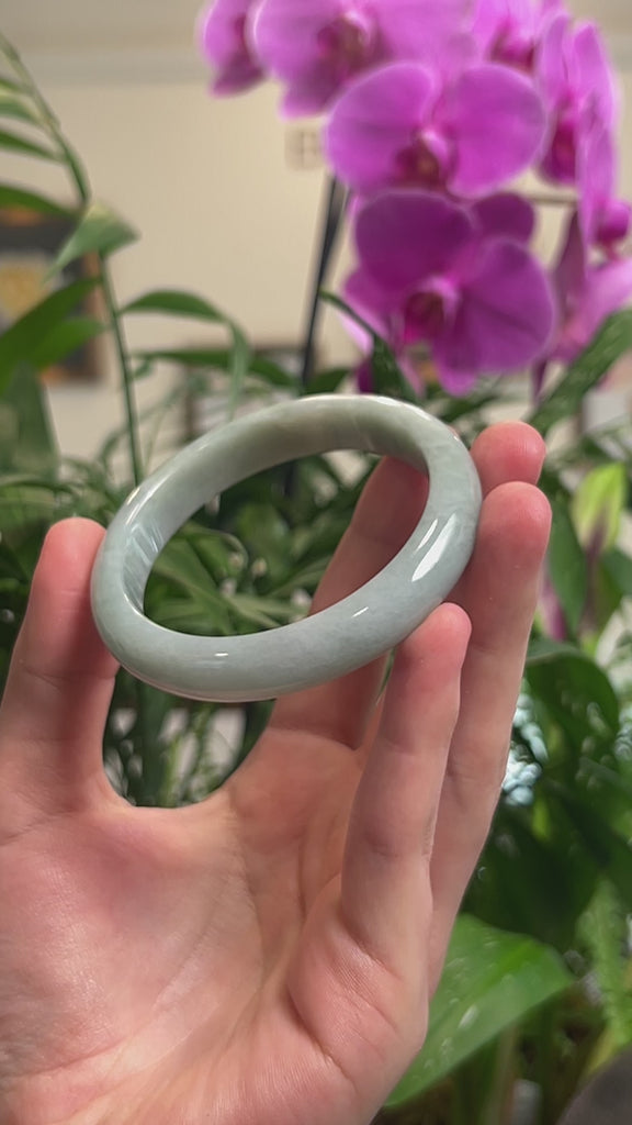 *DETAILS--- This bangle is crafted from genuine Burmese Jadeite jade that features a a light green color throughout. The texture is semi-smooth and translucent with some natural lines and cloudy spots that reflects the jade's genuine character. Designed in a half-round, comfort-fit style, the bangle is flat on the inside for a comfortable feel, perfect for everyday wear. Known for its durability, jadeite is also cherished as a symbol of good luck, protection, and harmony. Whether as a gift for yourself or a loved one, this jade bangle is a meaningful treasure that combines natural beauty, lasting craftsmanship, and exceptional value to cherish for years to come.
