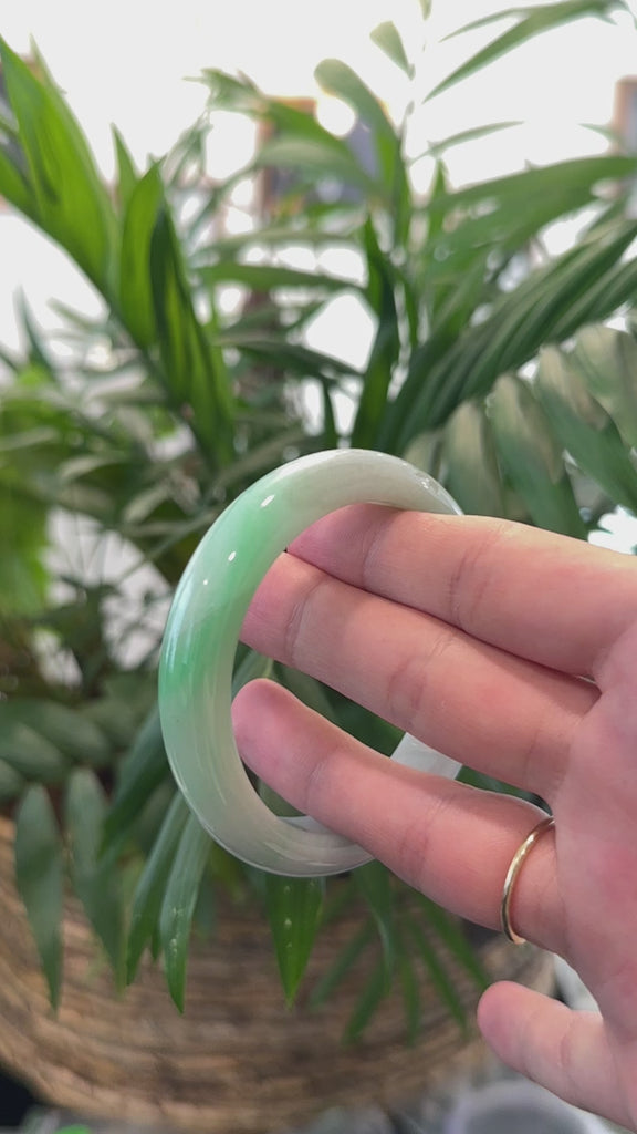 * DETAILS--- Genuine Burmese Jadeite Jade Bangle Bracelet. This bangle features a smooth, semi-translucent texture in a captivating light icy green hue and a patch of green apple color that is truly captivating and unique. Has some natural lines and cloudy texture. It's a half round, comfort-fit bangle, which is flat on the inside of the bangle and comfortable for everyday wear. Known for its durability, jadeite is also believed to bring good luck. This bangle makes a thoughtful and meaningful gift for yourself or someone special.