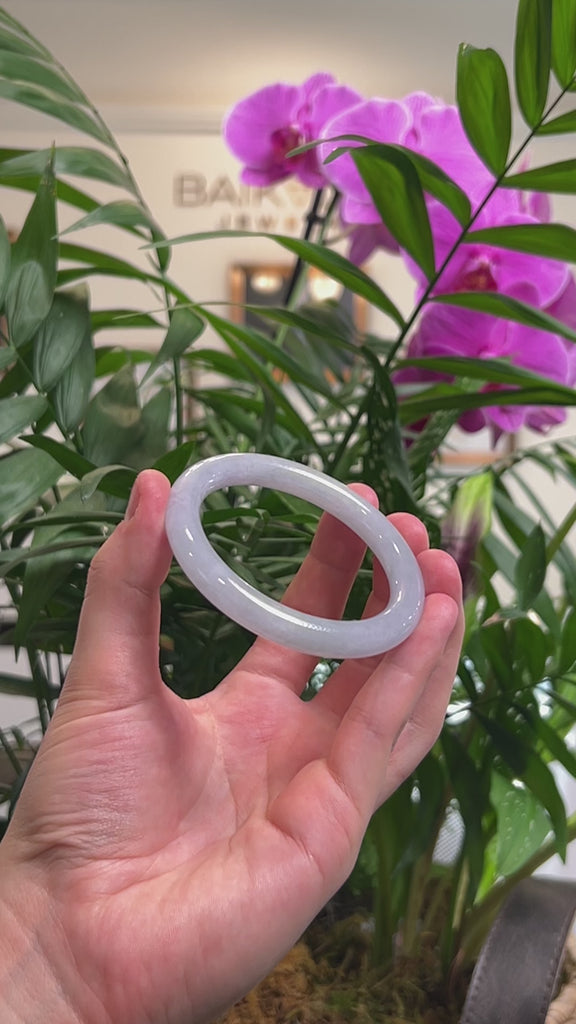 * DETAILS--- This bangle is crafted from fine quality genuine Burmese Jadeite jade that features a light icy lavender color throughout. The texture is translucent and smooth with no natural lines and minimal cloudy spots. It's a full round, traditional bangle, which is fully round throughout the bangle. Known for its durability, jadeite is also believed to bring good luck. Whether as a gift for yourself or a loved one, this jade bangle is a meaningful treasure that combines natural beauty, lasting craftsmanship, and exceptional value to cherish for years to come.
