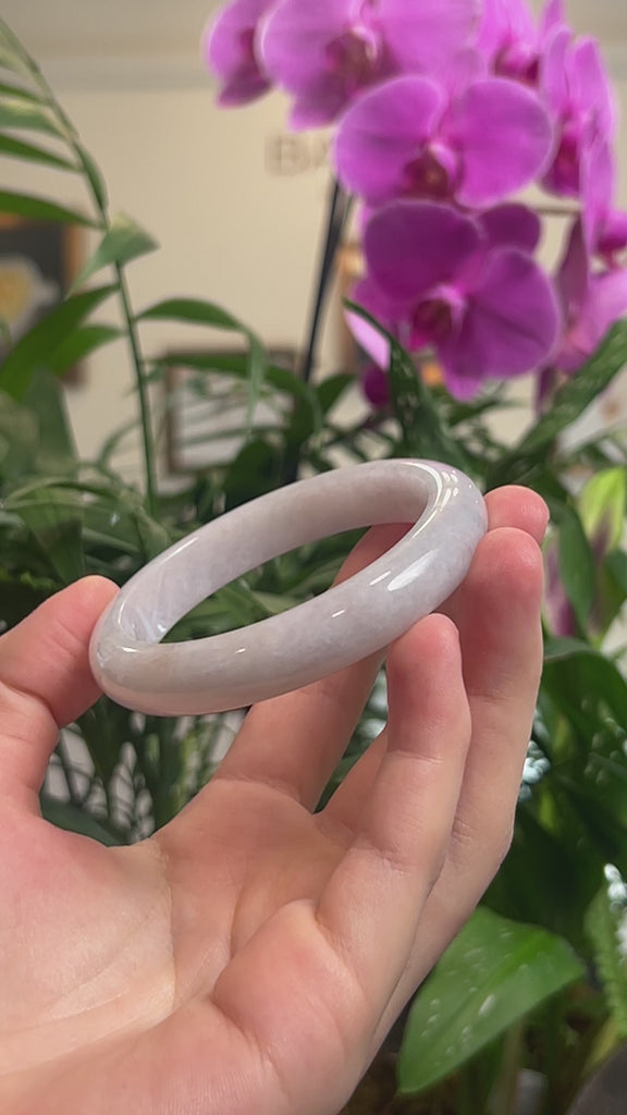 *DETAILS--- This bangle is crafted from natural Burmese Jadeite jade that features a a light lavender color throughout. The texture is semi-smooth and translucent with minimal natural lines and cloudy spots. Designed in a half-round, comfort-fit style, the bangle is flat on the inside for a comfortable feel, perfect for everyday wear. Known for its durability, jadeite is also cherished as a symbol of good luck, protection, and harmony. Whether as a gift for yourself or a loved one, this jade bangle is a meaningful treasure that combines natural beauty, lasting craftsmanship, and exceptional value to cherish for years to come.