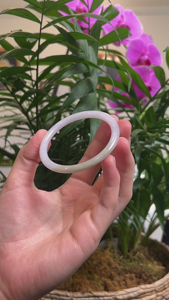 It's a full round, traditional bangle, which is fully round throughout. The width is more narrow than standard, creating a dainty look. Known for its durability, jadeite is also believed to bring good luck. Whether as a gift for yourself or a loved one, this jade bangle is a meaningful treasure that combines natural beauty, lasting craftsmanship, and exceptional value to cherish for years to come.