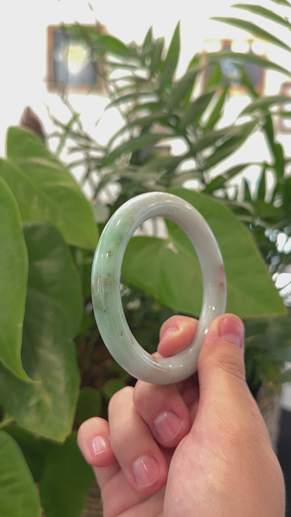 * DETAILS--- This bangle is crafted from genuine Burmese Jadeite jade. It features a smooth, semi translucent texture with patches of green colors that looks very beautiful and unique. Combined with the SaJin "Golden Dust" flower colors through out. It's a full round, traditional bangle, which is fully round throughout the bangle and this bangle features a wider width making this a more unique full round bangle. This bangle does have minimal natural lines and some cloudy spots through out. Known for its durability, jadeite is also believed to bring good luck. This bangle makes a thoughtful and meaningful gift for yourself or someone special.