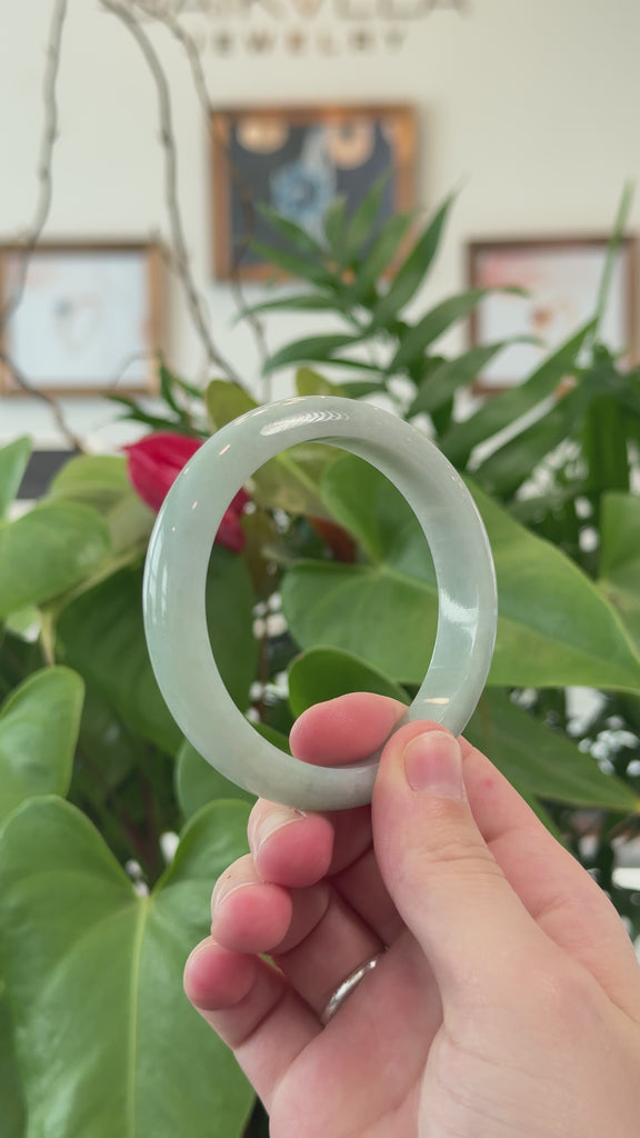 * DETAILS--This exquisite bangle is crafted from premium Burmese jadeite, showcasing a beautiful blend of green tones. Its smooth texture and timeless design exude elegance. The traditional round shape perfectly highlights the natural beauty of the jade, making it a versatile and stylish piece. A meaningful and thoughtful gift — perfect for yourself or someone truly special.