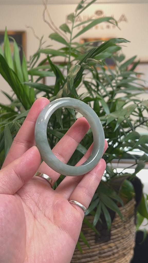 * DETAILS--- This bangle is crafted from genuine Burmese Jadeite jade. It features a soft oil-green color throughout with a small patch of white that adds to it's unique, natural beauty. The texture is smooth and semi-translucent texture with no natural lines and minimal cloudy spots. It's a half round, comfort-fit bangle, which is flat on the inside of the bangle and comfortable for everyday wear. Known for its durability, jadeite is also believed to bring good luck. This bangle makes a thoughtful and meaningful gift for yourself or someone special.