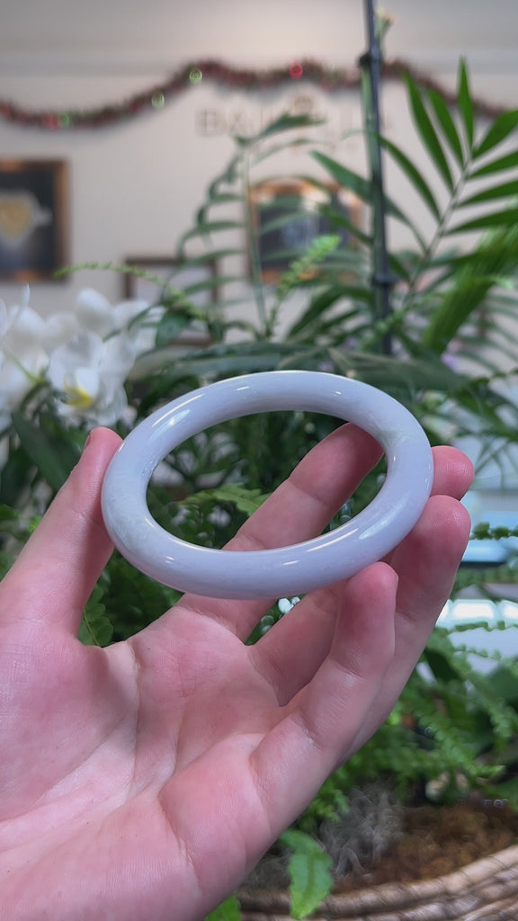 It's a full round, traditional bangle, which is fully round throughout the bangle. Known for its durability, jadeite is also believed to bring good luck. Whether as a gift for yourself or a loved one, this jade bangle is a meaningful treasure that combines natural beauty, lasting craftsmanship, and exceptional value to cherish for years to come.