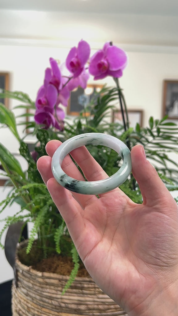 It's a half round, comfort-fit bangle, which is flat on the inside of the bangle and comfortable for everyday wear. Known for its durability, jadeite is also cherished as a symbol of good luck, protection, and harmony. Whether as a gift for yourself or a loved one, this jade bangle is a meaningful treasure that combines natural beauty, lasting craftsmanship, and exceptional value to cherish for years to come.