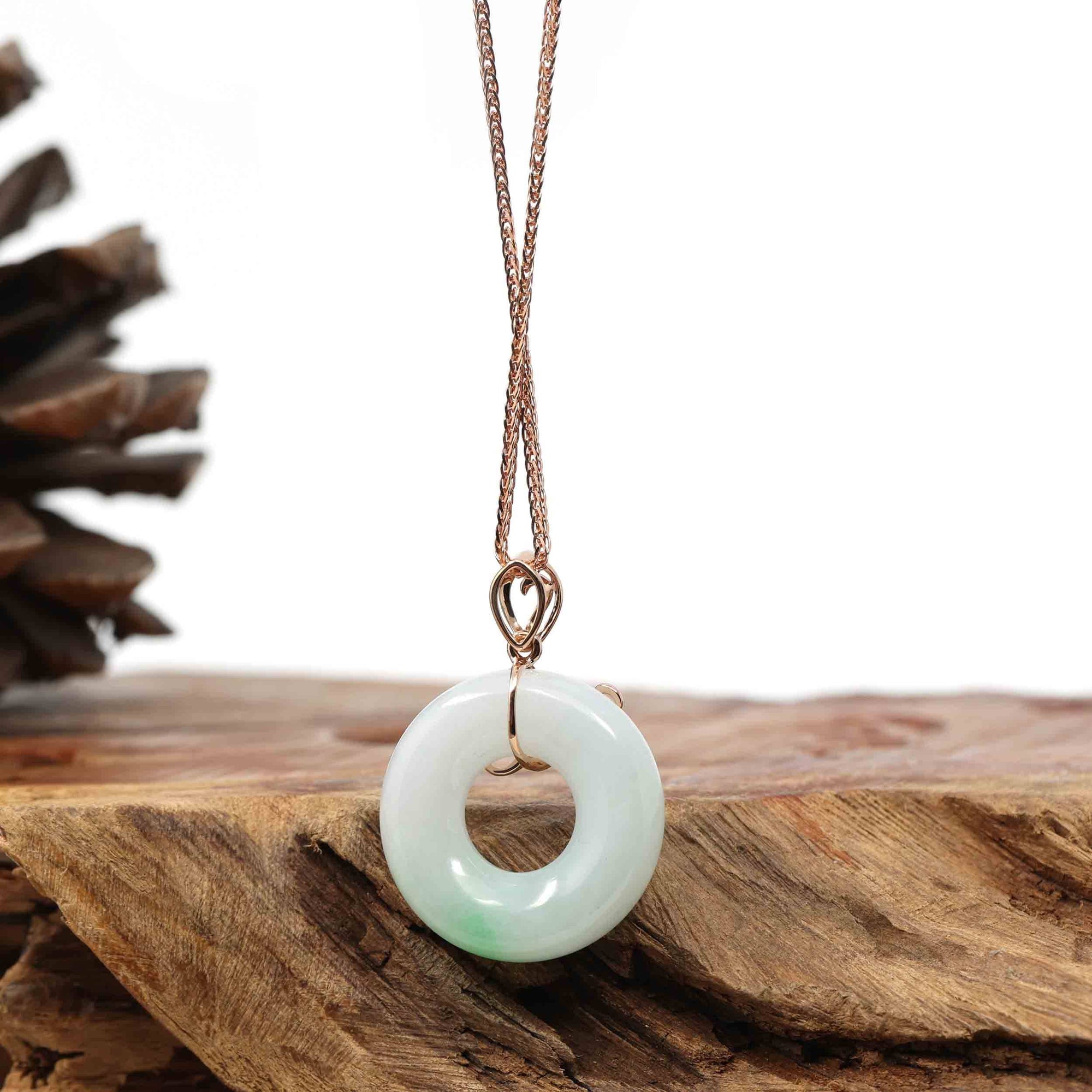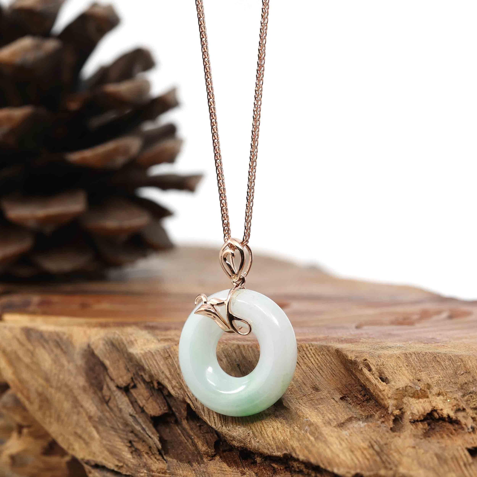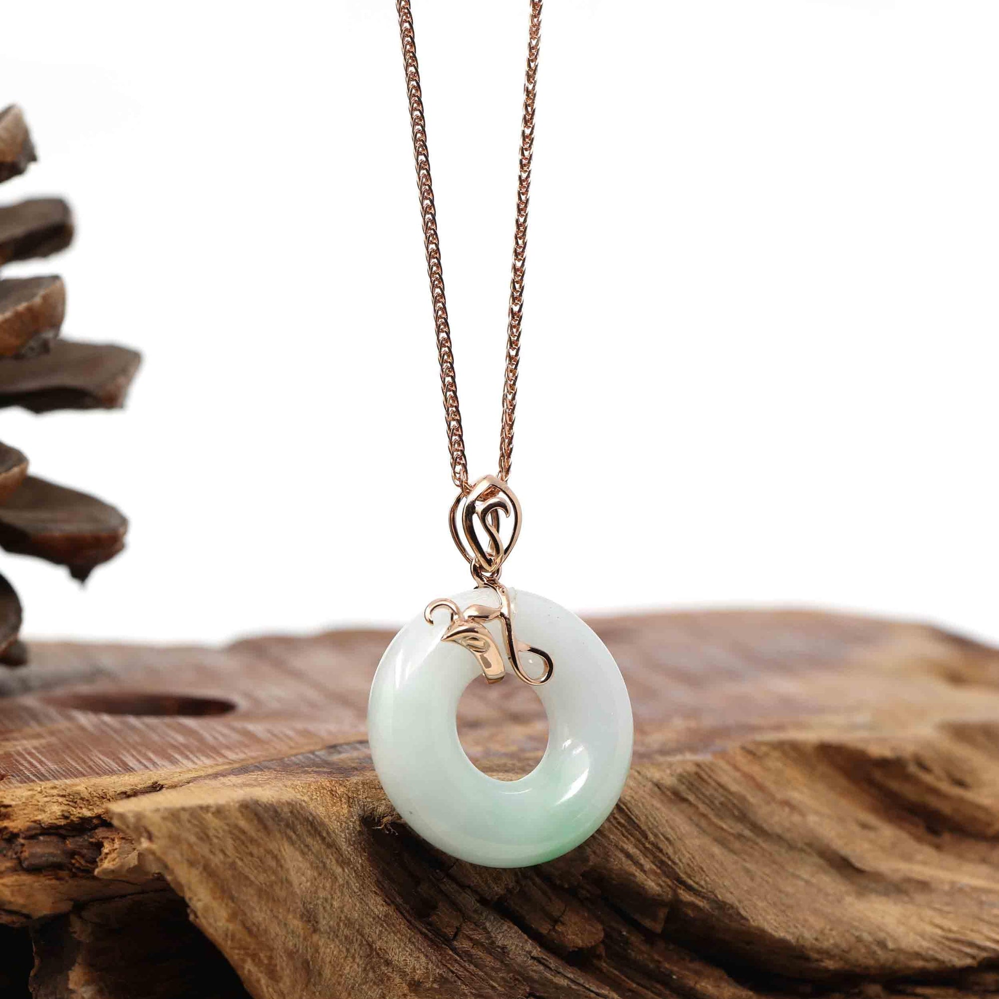 * DESIGN CONCEPT--- 18k Rose Gold & Genuine Burmese Jadeite Pendant Necklace. This pendant is made with high-quality genuine jadeite with some green, The jadeite piece looks so clean and smooth without any clouds or cracks or any dirty spots. The jadeite pendant's style is a good luck freedom bird standing on the lucky "Circle Of Heaven". It means prosperity, good luck, and safety. The pendant looks so lovely and exquisite. It's a perfect gift for yourself and your love.