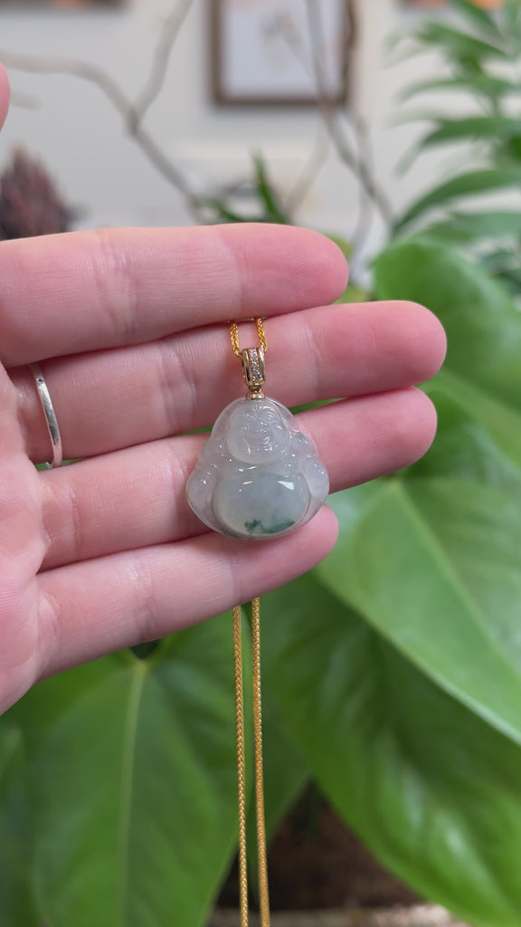 *Design concept--- This beautiful pendant is made from icy jadeite jade and features expert carving. Wearing a Happy Baby Buddha pendant is said to attract positive energy and uplift your surroundings. It symbolizes the release of negativity and encourages resilience. The term "Buddha" means "enlightened one," representing guidance and protection. This pendant embodies prosperity and good fortune, making it a perfect accessory for everyday wear.