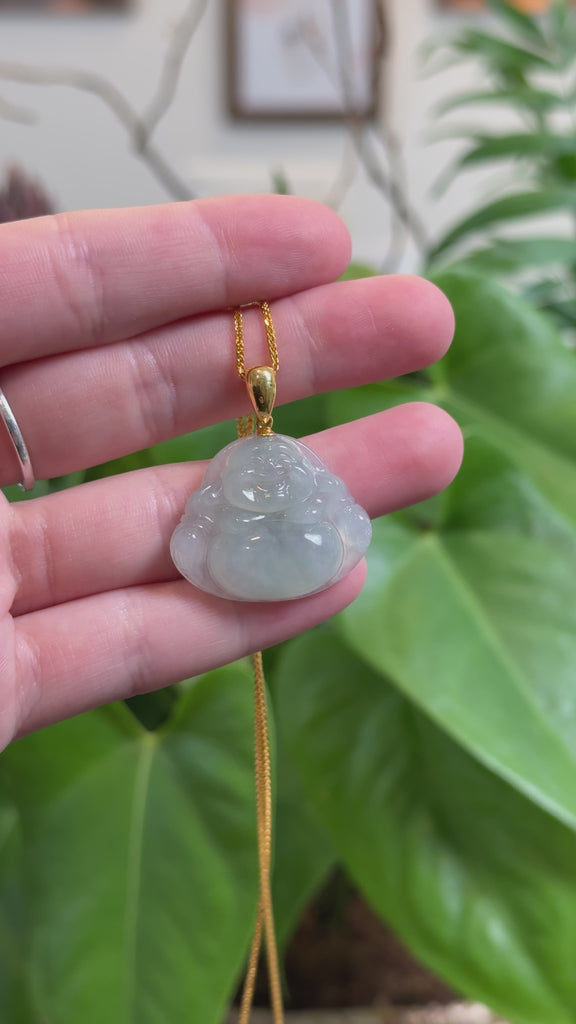 *Design concept--- This lovely pendant is made from icy blue-green jadeite jade with expert carving and an ice-like texture. Wearing a Happy Buddha pendant is believed to bring positive energy and joy. It symbolizes letting go of negativity and staying strong. "Buddha" means "enlightened one," offering guidance and protection. For those who follow Buddhism, this pendant represents good fortune and prosperity, making it a meaningful choice for daily wear.
