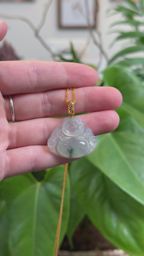 *Design concept--- This lovely pendant is made from icy blue-green jadeite jade with expert carving and an ice-like texture. Wearing a Happy Buddha pendant is believed to bring positive energy and joy. It symbolizes letting go of negativity and staying strong. "Buddha" means "enlightened one," offering guidance and protection. For those who follow Buddhism, this pendant represents good fortune and prosperity, making it a meaningful choice for daily wear.
