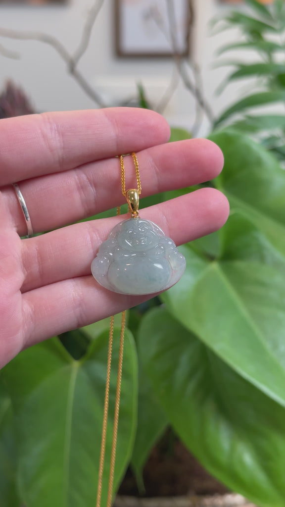 *Design concept--- This lovely pendant is made from icy blue-green jadeite jade with expert carving and an ice-like texture. Wearing a Happy Buddha pendant is believed to bring positive energy and joy. It symbolizes letting go of negativity and staying strong. "Buddha" means "enlightened one," offering guidance and protection. For those who follow Buddhism, this pendant represents good fortune and prosperity, making it a meaningful choice for daily wear.