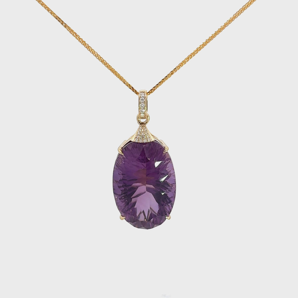 * INTRODUCTION--- Introducing our exquisite 14k Yellow Gold Genuine Amethyst and Diamond Pendant Necklace, a timeless piece that effortlessly bold yet elegant. Crafted with precision and attention to detail, this necklace features a radiant oval-cut genuine Amethyst gemstone, known for its captivating purple hue. Surrounding the Amethyst are delicate, sparkling diamonds that enhance the overall allure of the pendant. Elevate your jewelry collection with this stunning accessory that radiates sophistication and showcases your impeccable taste in fine craftsmanship.