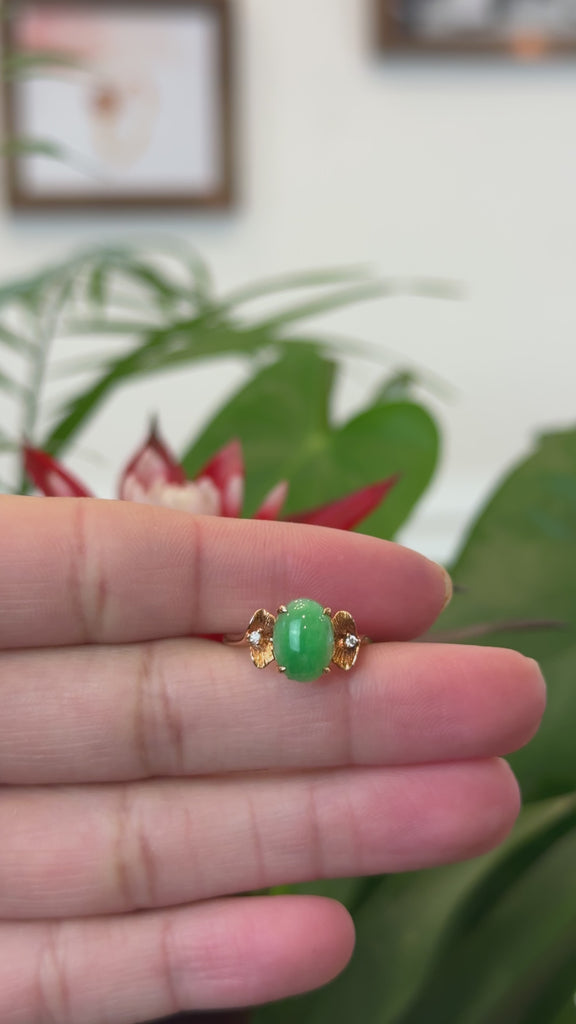 This ring features a stunning oval imperial Jadeite cabochon stone. Stunning combination. Color is photographed exactly to the actual stone; it's slightly included with natural inclusions. The design is simplistic yet elegant. (Exceptional Translucency)