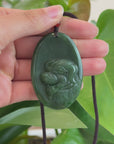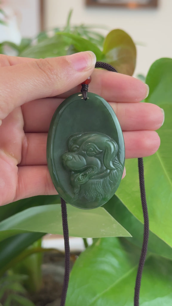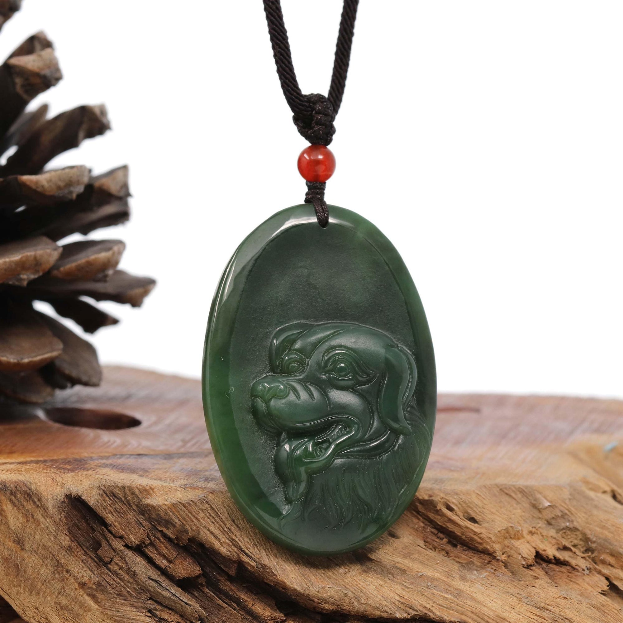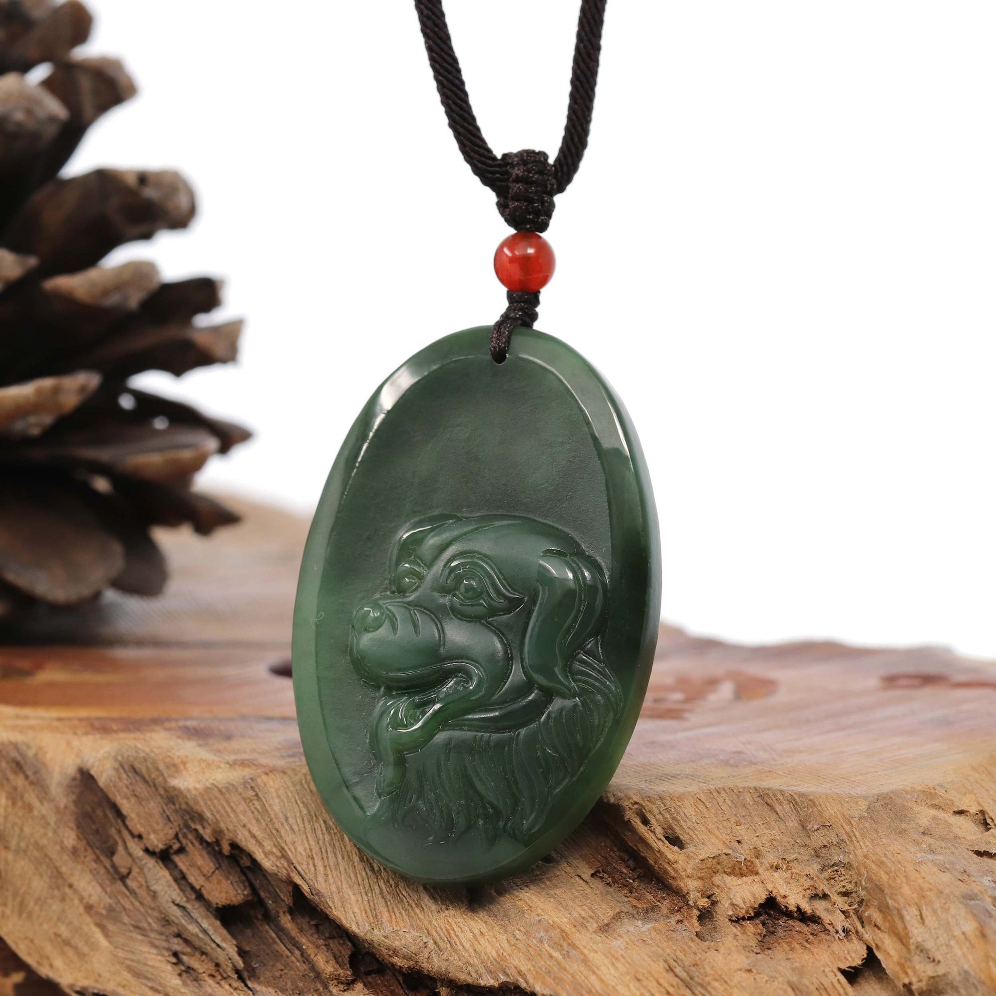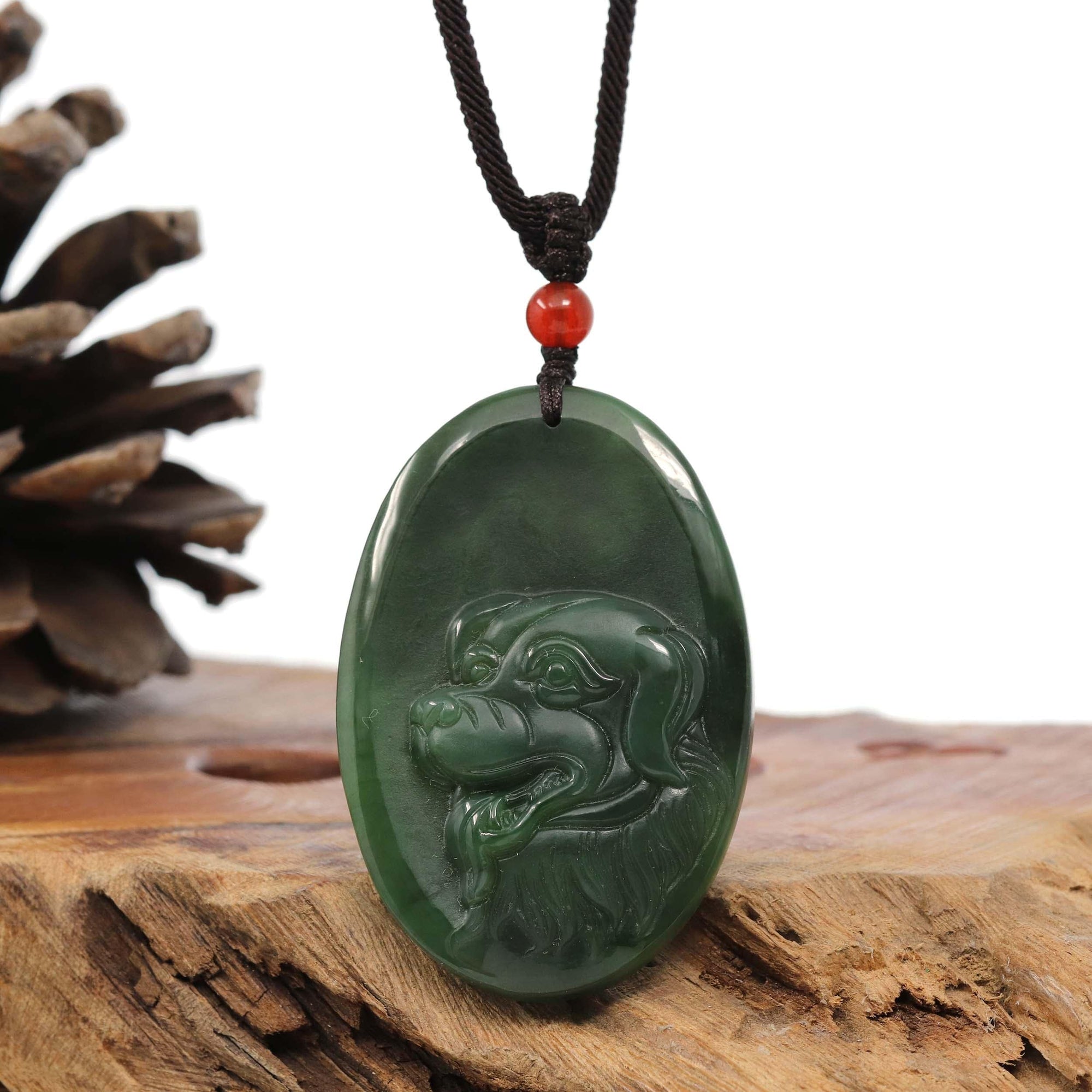 Natural Jade 12 Zodiac: Nephrite Jade Dog Pendant Necklace in Deep Green