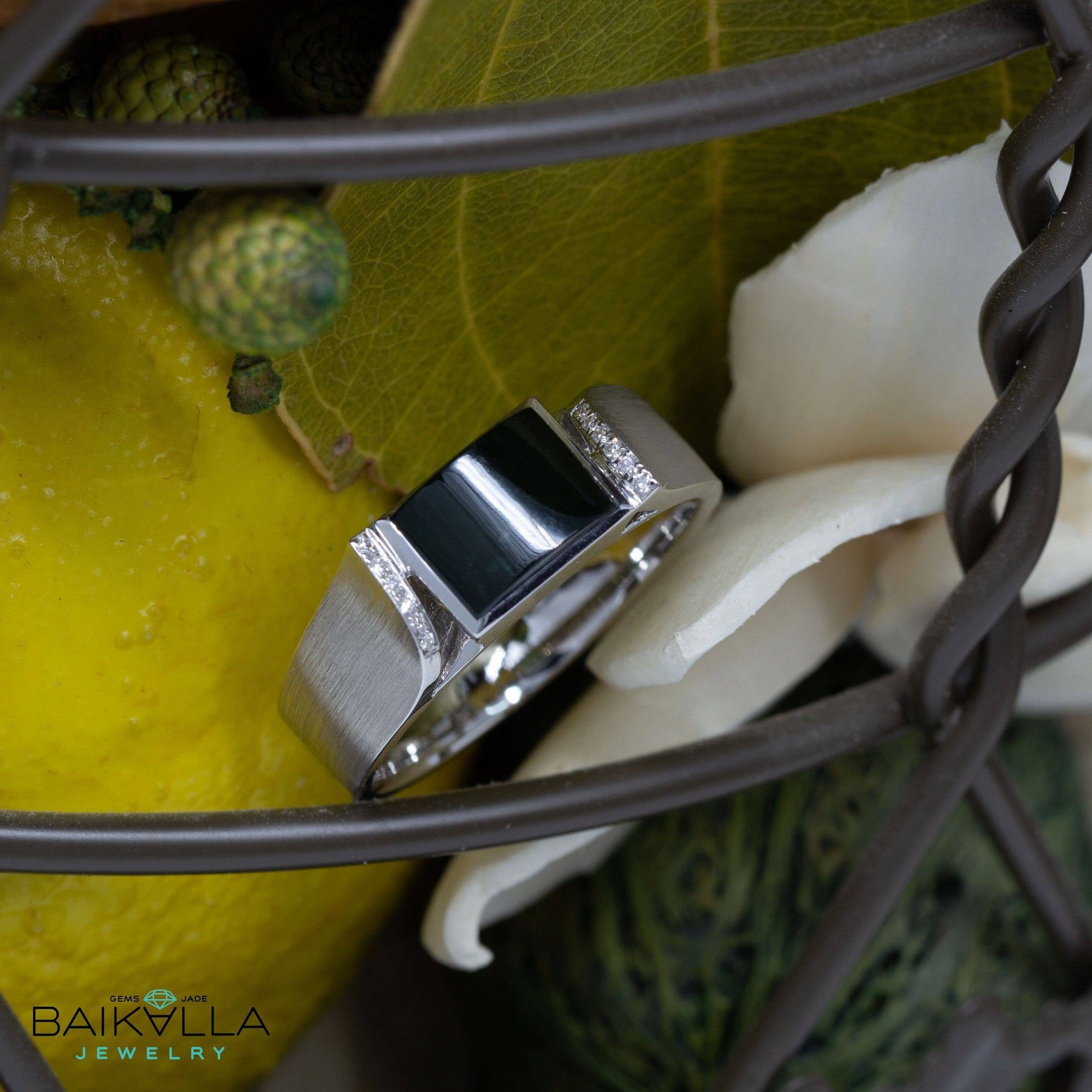 * DESIGN CONCEPT---  This ring is made with high-quality genuine Burmese black jadeite jade. The black jadeite actually shows the emerald green color under the light and very translucent as the picture shows. Bezel set emerald cut stone with unique side stone design, truly a mesmerizing combination. Black jade is relatively a rare stone to be found in rings, but they sure are beautiful.  It also features genuine halo diamonds. The design was inspired by the simplistic designs of a bar ring for men. Fine polish. Every detail and angle is perfect. It's a very unique nice men's ring.