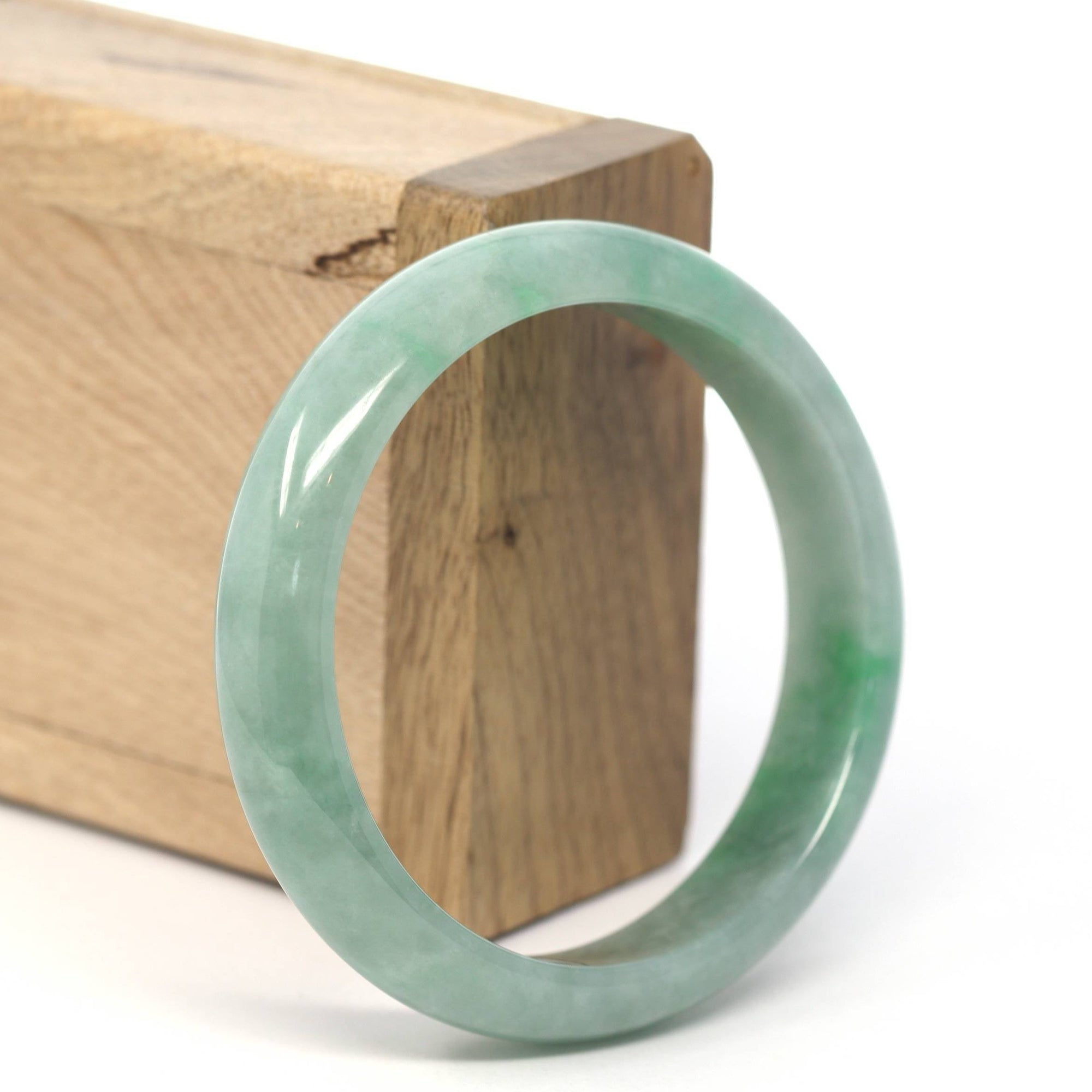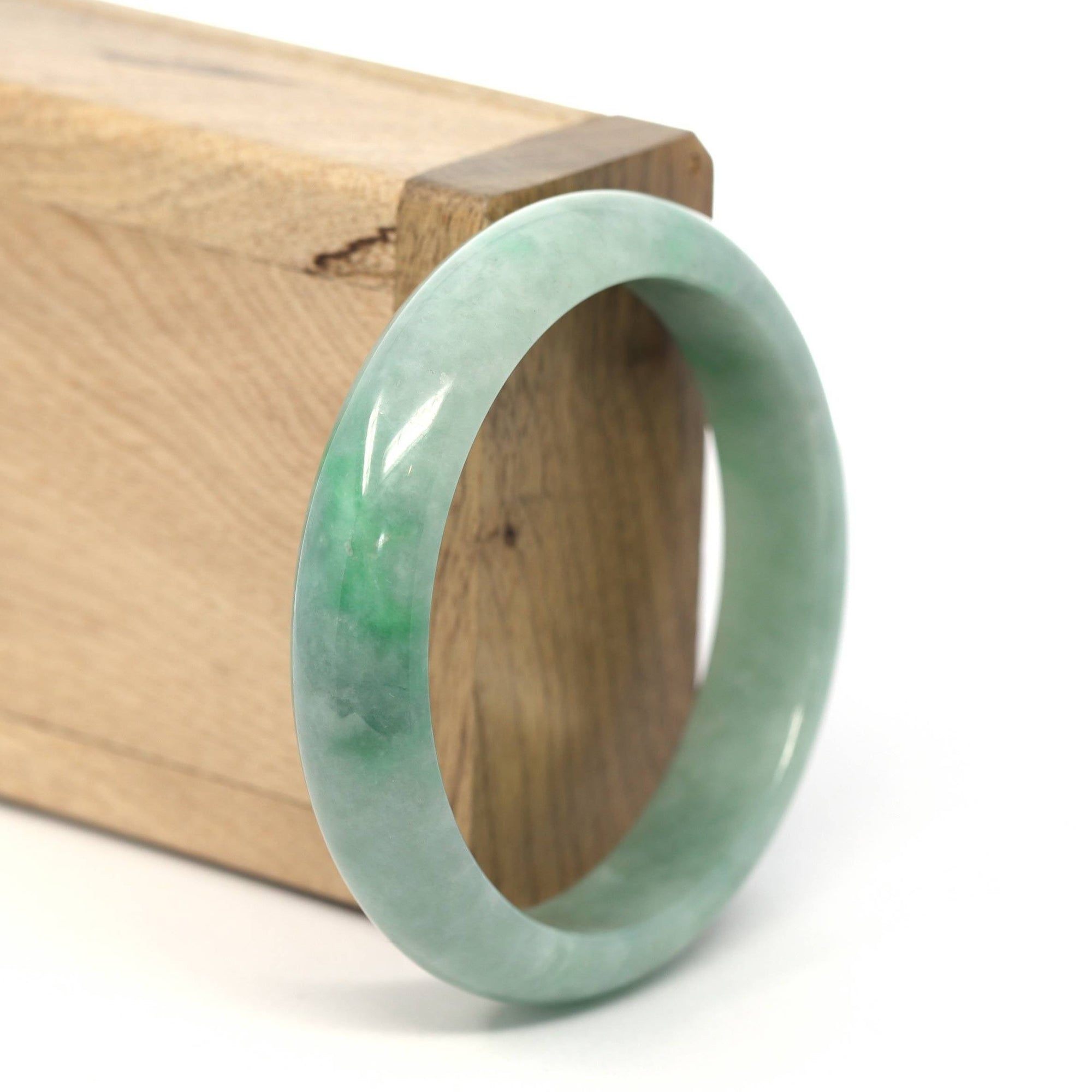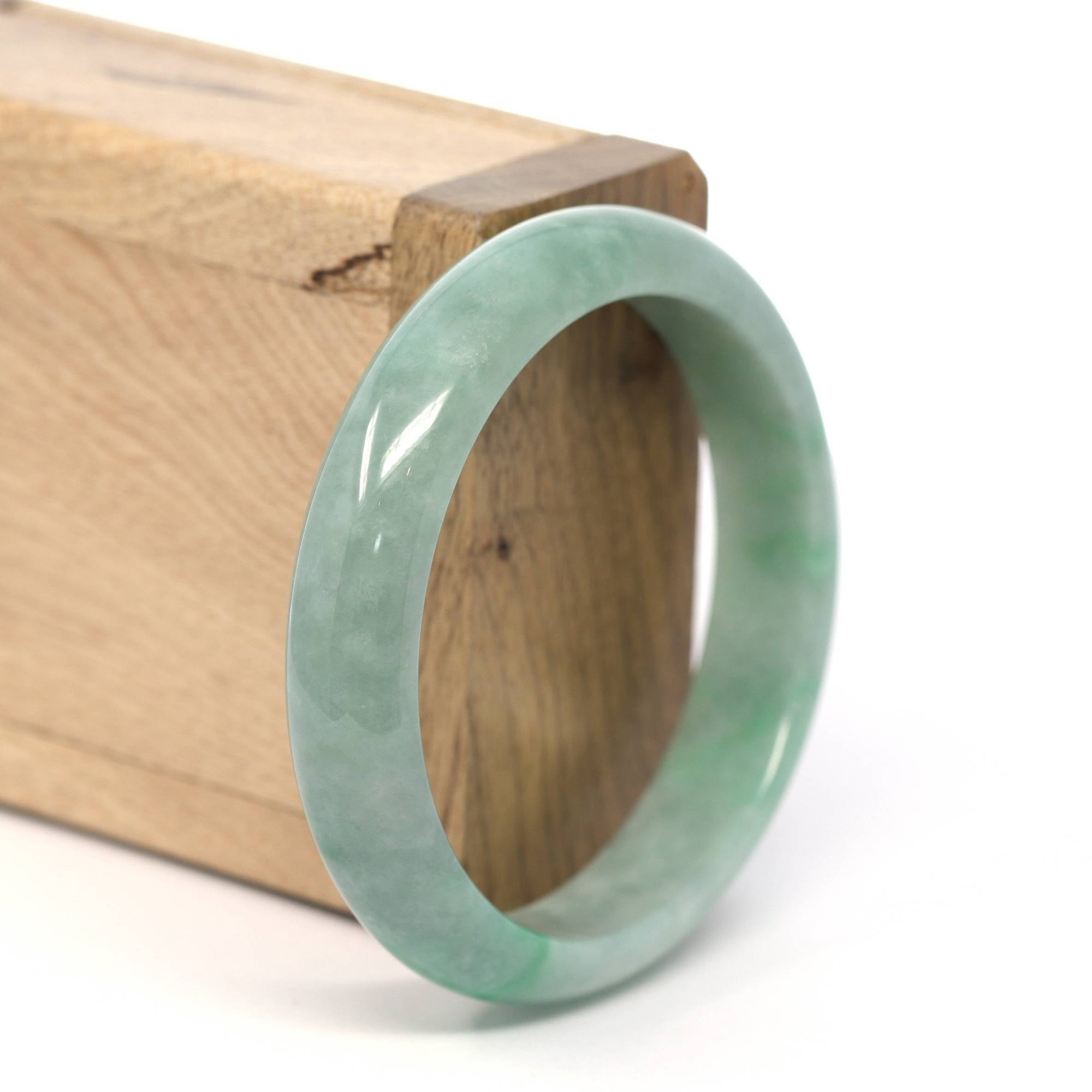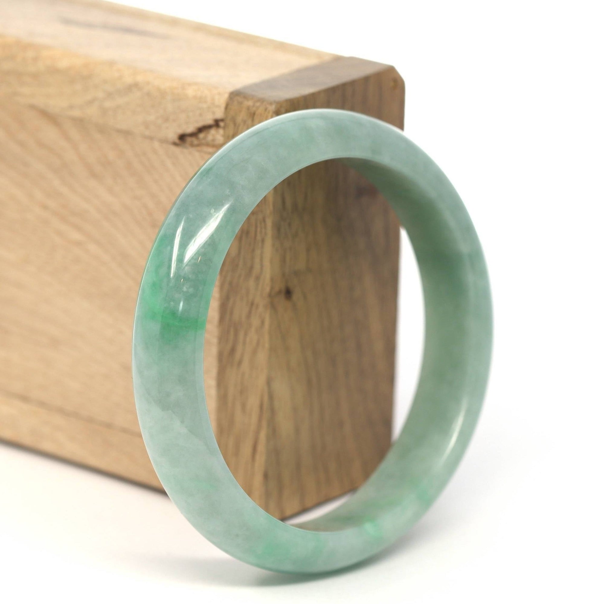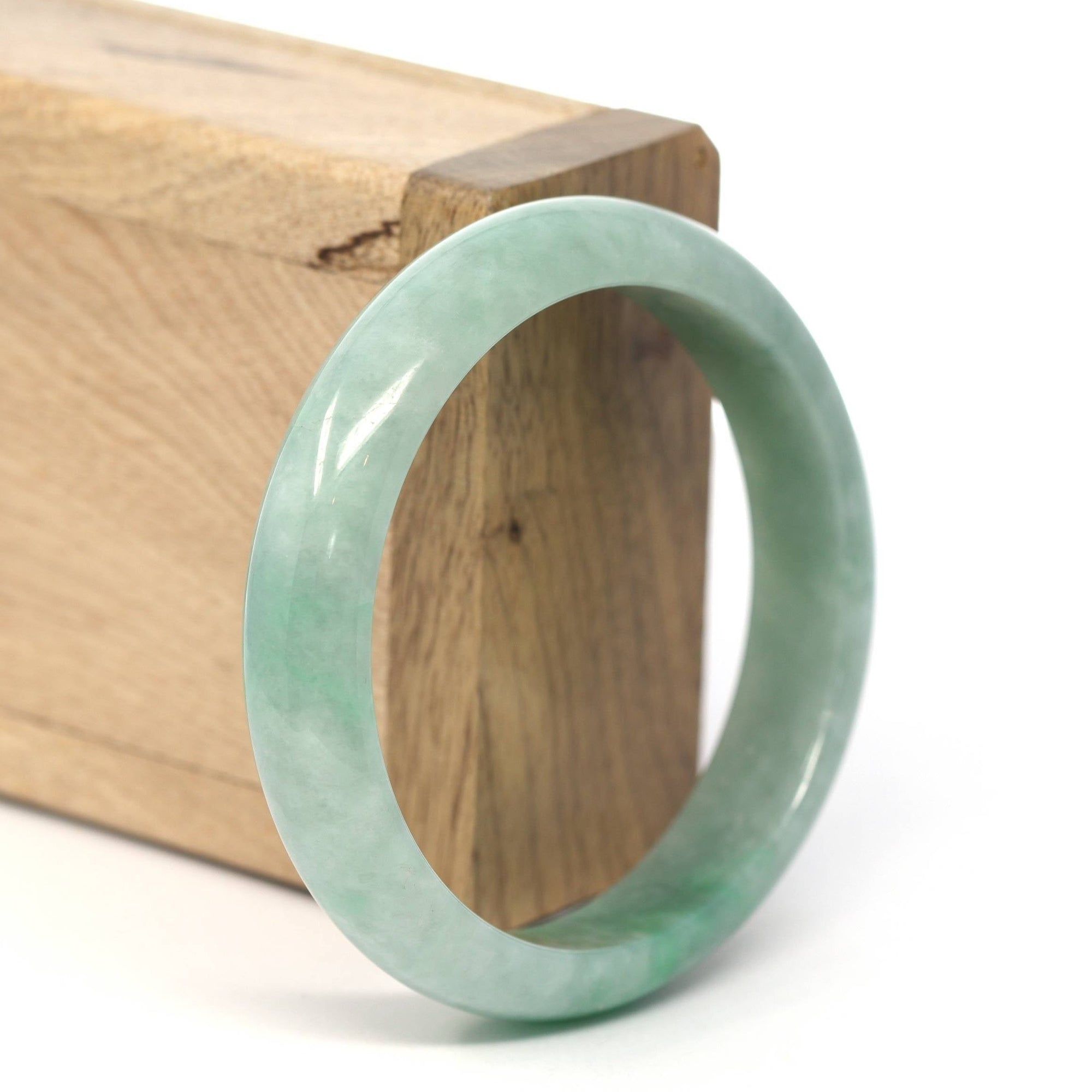 * DETAILS--- Genuine Burmese Jadeite Jade Bangle Bracelet. This bangle is made with fine genuine Burmese Jadeite jade. The jade texture is fine and smooth with green color. It just has little clouds and a natural stone line. The Classic half-round comfort style bracelet. Jadeite jade is the toughest gemstone on the planet. People believe the real jade is a lucky gemstone. It's a special gift for you and your love.