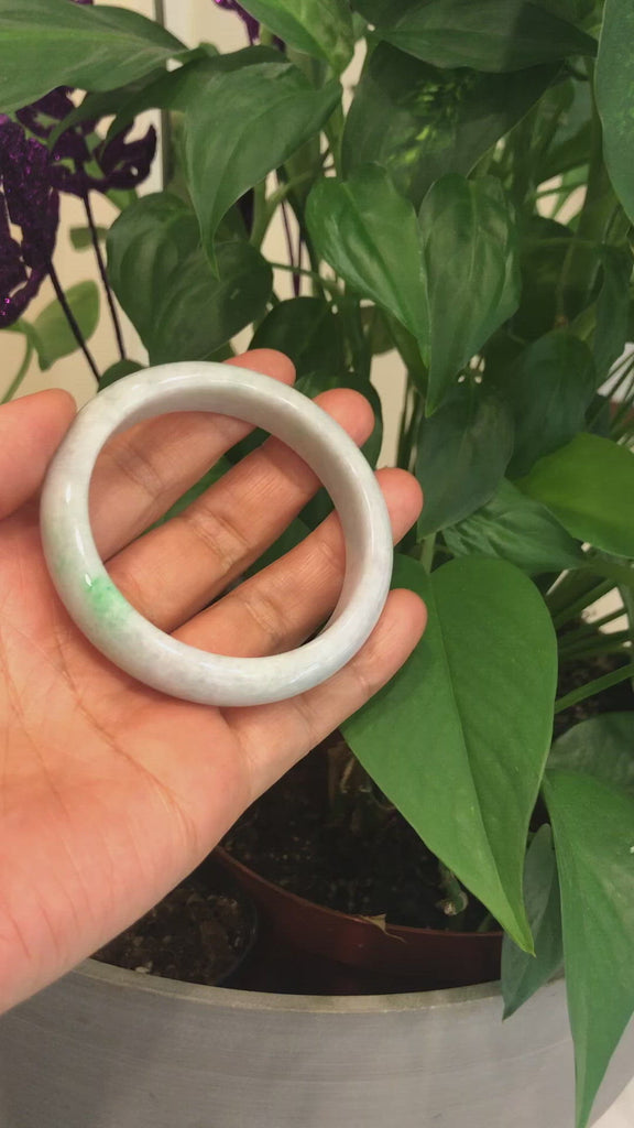 * DETAILS--- Natural Green Genuine Burmese Jadeite Jade Bangle Bracelet. All Baikalla Jewelry's Jade Bangles are guaranteed to be untreated. The jade texture is relatively fine with some patches of varieties of gorgeous light green color throughout. Spots of the green lavender colors are light and stunning as seen in the pictures. With little cloudy spots. The color is truly mesmerizing. The Classic half-round style bracelet is comfortable. It's very luxurious, high-quality, and affordable. It's a high-quality gift for yourself or your love.