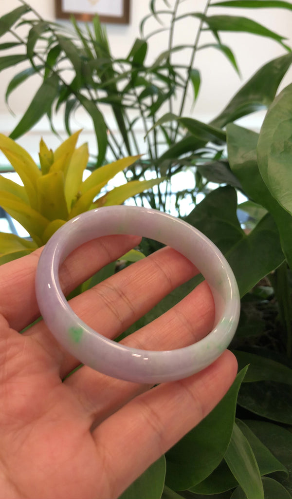 * DETAILS--- Genuine Burmese Jadeite Jade Bangle Bracelet. This bangle is made with very high-quality genuine Burmese lavender green Jadeite jade, the jade texture is translucent and smooth. The green color and translucent lavender texture, are truly a mesmerizing combination. The Classic half-round style bracelet, And looks much better in person. it's gorgeous and affordable with more colors and good texture. This bangle is characterized by beautiful vibrant green patches. And very minor stone clouds but there is a little natural stone line. the bangle does have a beautiful, simple, luxurious look to it. Jadeite jade is a tough stone, It.s a special gift for you and your love.