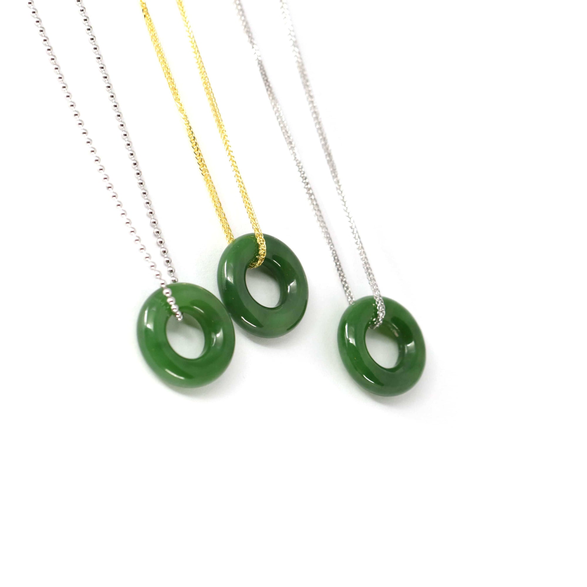 * Sense Of Design---Meaning: The simple shape of a circle represents things such as happiness, wholeness, and prosperity. Or as Sotheby's auction house called a jade bangle. "Circle of Heaven". This necklace is made with very high-quality genuine He Tian nephrite jade. Which produces some of the finest in the world. Refined, exquisite. Very very slightly included. Gifting one of these is like wishing the best luck upon your family or loved ones. It's a perfect gift.
