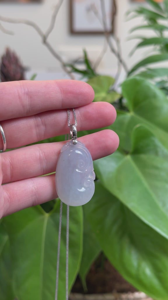 *Design concept-- "Ruyi" in Chinese literally means, "as you wish." This necklace portrays the timeless, good luck symbol in natural ice jadeite jade with light blue colors, Perfect for a gift for a friend who is venturing into a new chapter of life or a someone who is venturing into a new business.