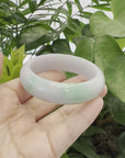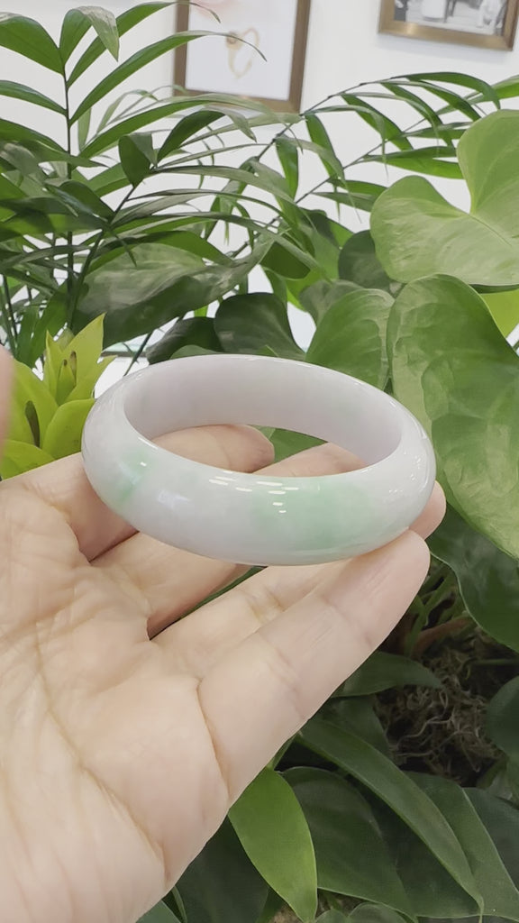 * DETAILS--- This bangle is made with high-quality genuine Burmese white Jadeite jade, the jade texture is so transparent with some green colors inside. The green color and transparency white texture, truly a mesmerizing combination. The Classic half-round style bracelet.  It looks clean with a light lavender white texture. it's gorgeous and lovely with a smooth texture. It's a wider bangle. It's a perfect gift for yourself or your love. It's a collectible item.