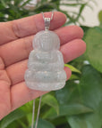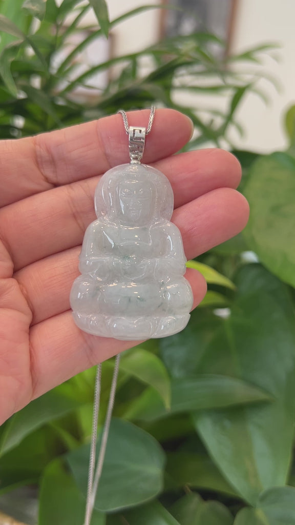 "Goddess of Compassion" Genuine Burmese Ice Blue Jadeite Jade Guanyin Necklace With Good Luck Design Sterling Silver Bail